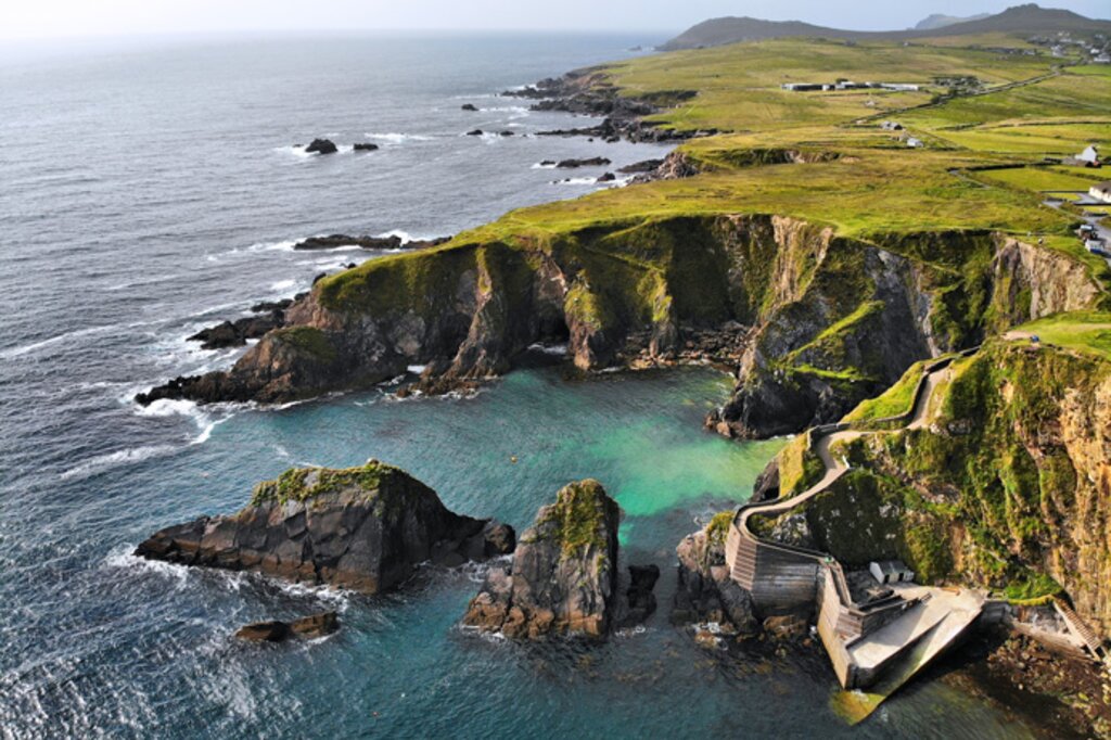 <Die vierte Etappe des Dingle Way führt dich stets der Küste entlang, teils auf ruhigen Straßen, teils direkt am Strand. Pack dir in Dingle Proviant für ein Picknick ein, denn der Weg nach Dunquin bietet großartige Ausblicke auf grüne Hügel, Klippen und das Meer. Du verlässt Dingle und gehst nach Ventry, wo du am Strand weiterwanderst. Immer wieder wirst du an Aussichtspunkte gelangen, die zu einer Pause einladen. Der Mount Eagle erhebt sich rechts von dir, und wenn du genug Zeit hast, kannst du den Gipfel für eine beeindruckende Aussicht erklimmen. Den Tag über genießt du den Blick auf die wilde Küstenlandschaft und erreichst schließlich das kleine Dunquin.