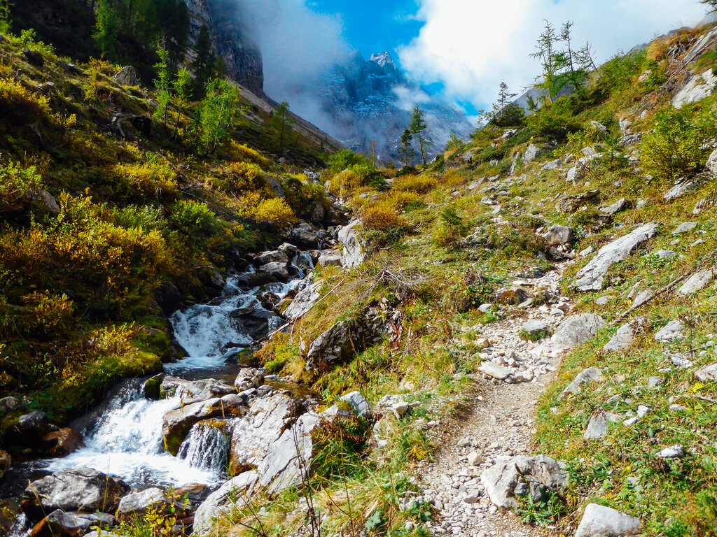 <Am Ufer des Wolayer Sees entlang wanderst du zum Valentintörl hinauf, wo bis zum Hochsommer Schneefelder liegen können. Das Geröll auf dem Abschnitt macht die Etappe anstrengend, aber der abgekürzte Weg über Wiesen und Waldpfade zur Valentinalm gestaltet sich angenehmer. Über die Plöckenpass-Straße erreichst du das gleichnamige Gasthaus, von wo aus du den Grünsee erreichst und anschließend die Obere Spielbodenalm. Du passierst die Kammhöhe auf 2.158 Metern Höhe und steigst dann ab zu der Oberen Bischofsalm. Nach einem kürzeren Anstieg durch Waldgebiet erreichst du die Zollnersee Hütte auf 1.738 Metern Höhe.