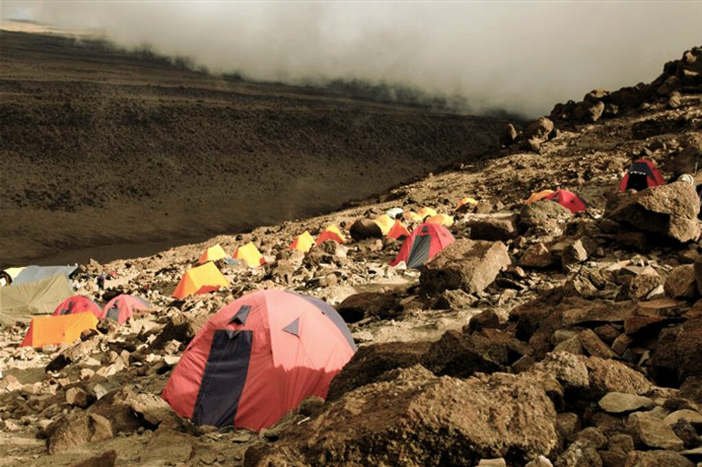 <Im Gegensatz zu den anderen Camps bietet das Barafu Camp kaum ebene Flächen. Die Zelte werden daher im Geröll und meist bei extrem windigen Bedingungen aufgestellt. Nach dem Abendessen solltest du deine persönliche Ausrüstung für den am Folgetag bevorstehenden Gipfelansturm bereitlegen und möglichst früh schlafen gehen, da bereits gegen 23.00 Uhr wieder Wecken angesagt ist. Nachdem du um ca. 23.00 geweckt wirst, läufst du bei klirrender Kälte (oft unter -10°C) mit Stirnlampe und warmer Kleidung ausgerüstet los über die ungeschützten, nur schemenhaft erkennbaren Gipfelhänge des Kiilimanjaros.