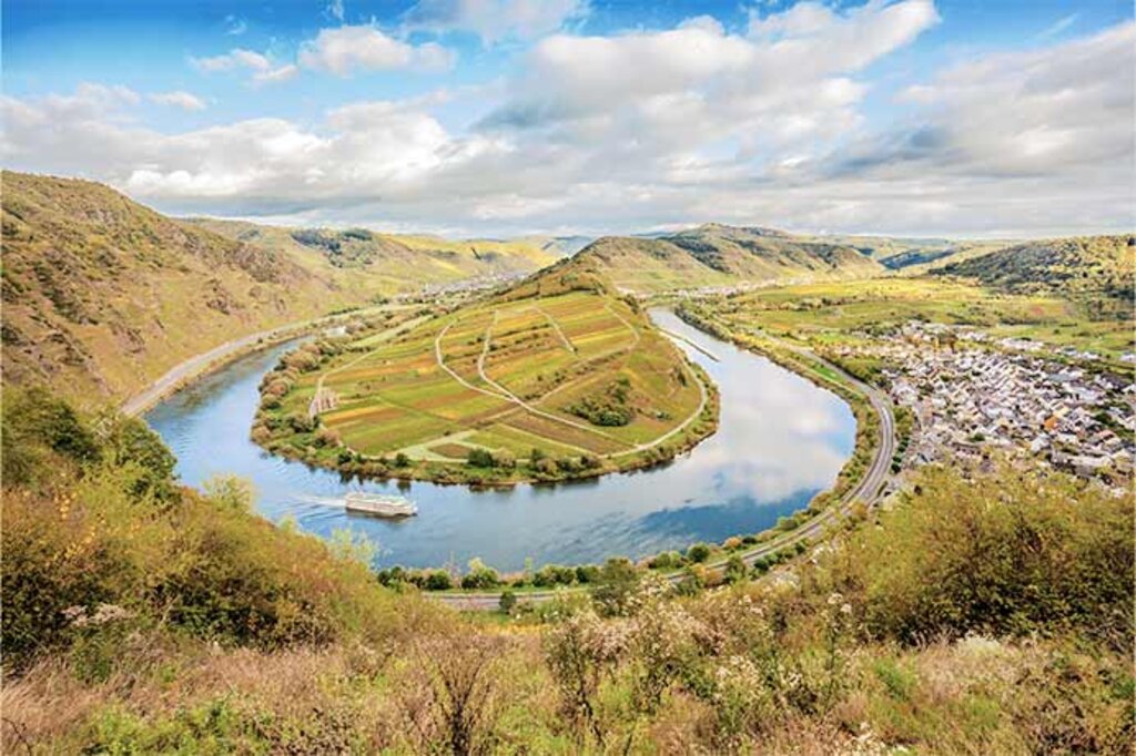 <Direkt zu Beginn des heutigen Wandertages geht es zum Höhenzug am rechten Moselufer hinauf, wo du immer wieder einen fantastischen Blick auf die Moselschleife bei Trittenheim genießen kannst, die tief unter dir im Tal liegt. Danach geht es abwechselnd durch Wald- und offene Wiesenlandschaften. In Neumagen-Dhron endet der Weg an der Anlegestelle der "Stella Noviomagi", dem Nachbau eines römischen Weinschiffs.
