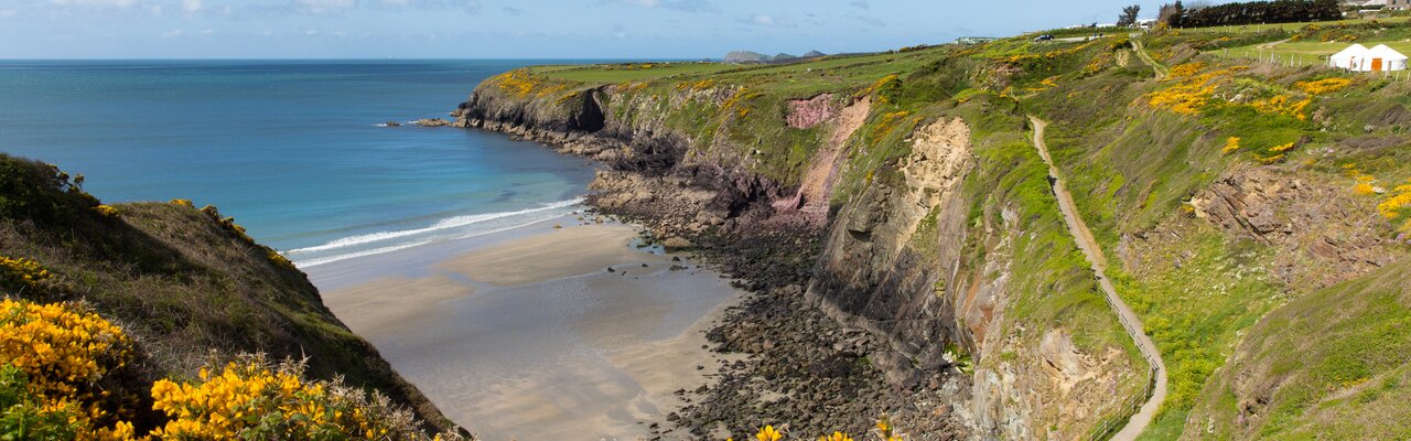 <Über sanfte Wiesen und verhältnismäßig niedrige Klippen folgen Sie dem Pfad, der Ihren Beinen heute etwas Entspannung gönnt. Der rote Sandstein, der die Umgebung zeichnet, leuchtet Ihnen beinahe entgegen. Auf dieser Etappe ist die ganze Vielfalt von Flora und Fauna besonders beeindruckend, auch der Weitblick über St. Bride's Bay ist einmalig. Bei Broad Haven haben Sie das Etappenziel erreicht.