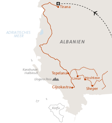 <Die Überquerung der Dhembel-Nemercke-Kette ist der Weg zurück in die Außenwelt. In einer schattigen Rinne geht es hinauf zu den Almen des fast vegetationslose Alpental, flankiert von steilen Hängen, und zum Dhembel-Pass (1.450 m). Von dort aus bieten sich Blicke auf die östlichen Berge gegenüber in Griechenland und in die Kleinstadt Permet weit unten. Der lange, felsige und anspruchsvolle Abstieg erfordert Aufmerksamkeit und führt nach Leuse, einem Steindorf mit einer Kirche, die vielleicht die schönste in Südalbanien ist. Von hier ist es nur ein kurzer Fußweg zu Ihrer Unterkunft. -