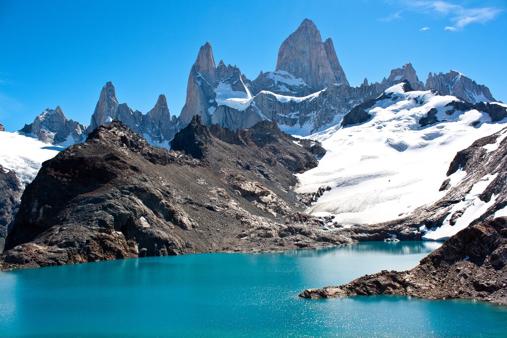 Von hier aus führt der Weg ca. 400 Höhenmeter aufwärts. Auf der Moräne mit einem außergewöhnlichen Blick auf die De Los Tres Lagune (1.190m) und Gletscher ist das Ziel erreicht. Es ist der magische Standort, wo der Fitz Roy (3.405m), der Poincenot (3.002m) und seine benachbarten Spitzen eine der bekanntesten Postkarten Patagoniens schenken können. Der Abstieg zur Lagune bis zur Mündung führt zu einem zusätzlichen beeindruckenden Anblick: die Laguna Sucia.