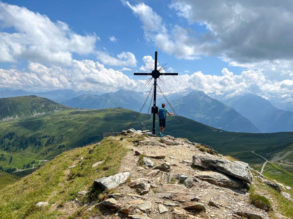<Per Seilbahn schweben Sie zum Wildkogel, wo Sie auf 2.000m Höhe zu einer ausgedehnten Panoramawanderung starten. Über grüne Höhenzüge von Joch zu Joch und von Scharte zu Scharte. Unter dem rötlichen Zacken des Rettensteins wandern Sie entlang der Grenze zu Tirol und bestaunen Fernblicke zum Wilden Kaiser und zum Kitzbüheler Horn. Nach Einkehr bei der Almhütte und Besuch im Nationalpark-Panorama schweben Sie mit der Gondel ins Tal.