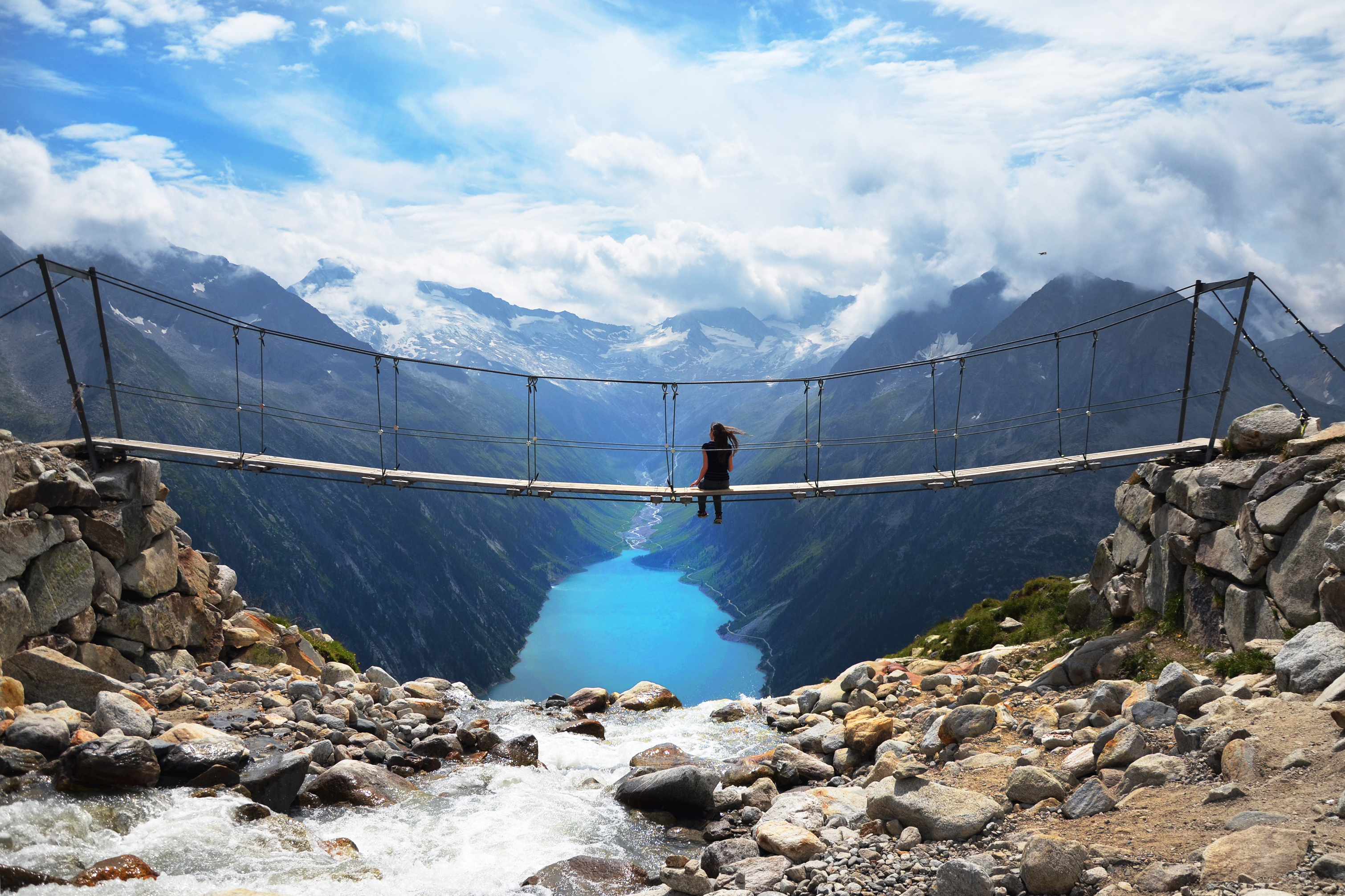 <Nach der langen Etappe gestern, bietet der heutige Weg etwas mehr Entspannung. Der Weg führt Sie erst zum Peterköpfl, dieser kleine Vorgipfel lädt dazu ein, ein weiteres Steinmandl zu den vielen bereits vorhandenen hinzuzufügen. Steinmandl sind geschichtete Steine, die ähnlich einem Schneemann markant aus der Umgebung hervorstechen. Früher wurden damit die Wege im rauen Hochgebirge markiert, heute dienen sie als einzigartige Fotomotive und bieten die Möglichkeit sich auf dem Gipfel zu verewigen. Der Weg führt Sie weiter auf die Friesenbergscharte zu. Sie folgen den Schildern auf dem Berliner Höhenweg schließlich zur Olpererhütte. Diese Hütte thront majestätisch über dem Schlegeisspeichersee und bietet mit einer kurzen Hängebrücke die ideale Gelegenheit für ein perfektes Erinnerungsfoto.