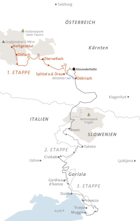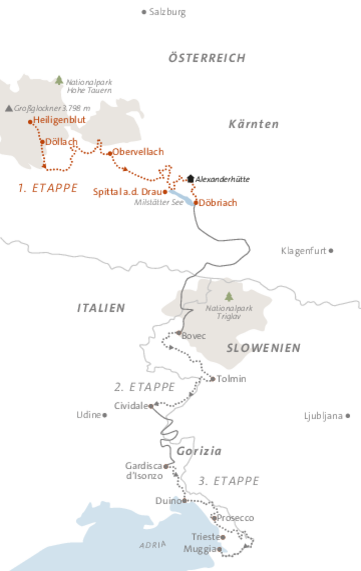 Der Alpe-Adria-Trail eröffnet Ihnen ein Weitwander-Erlebnis der Superlative und macht garantiert Lust auf noch mehr! Auf traumhaften Etappen geht es vom Fuße des Großglockners entlang der Pasterze, dem größten Gletscher der Ostalpen über urige Bergbauernhöfe und Almen weiter zur höchstgelegenen Wallfahrtskirche Österreichs, dem Marterle. Über die alpine Perle Mallnitz und zwei beeindruckende Schluchten wird der historische Marktplatz Obervellachs erwandert und von dort aus geht es in zwei spannenden Tagesetappen bis ans Ende des Nationalparks Hohe Tauern in Kärnten.