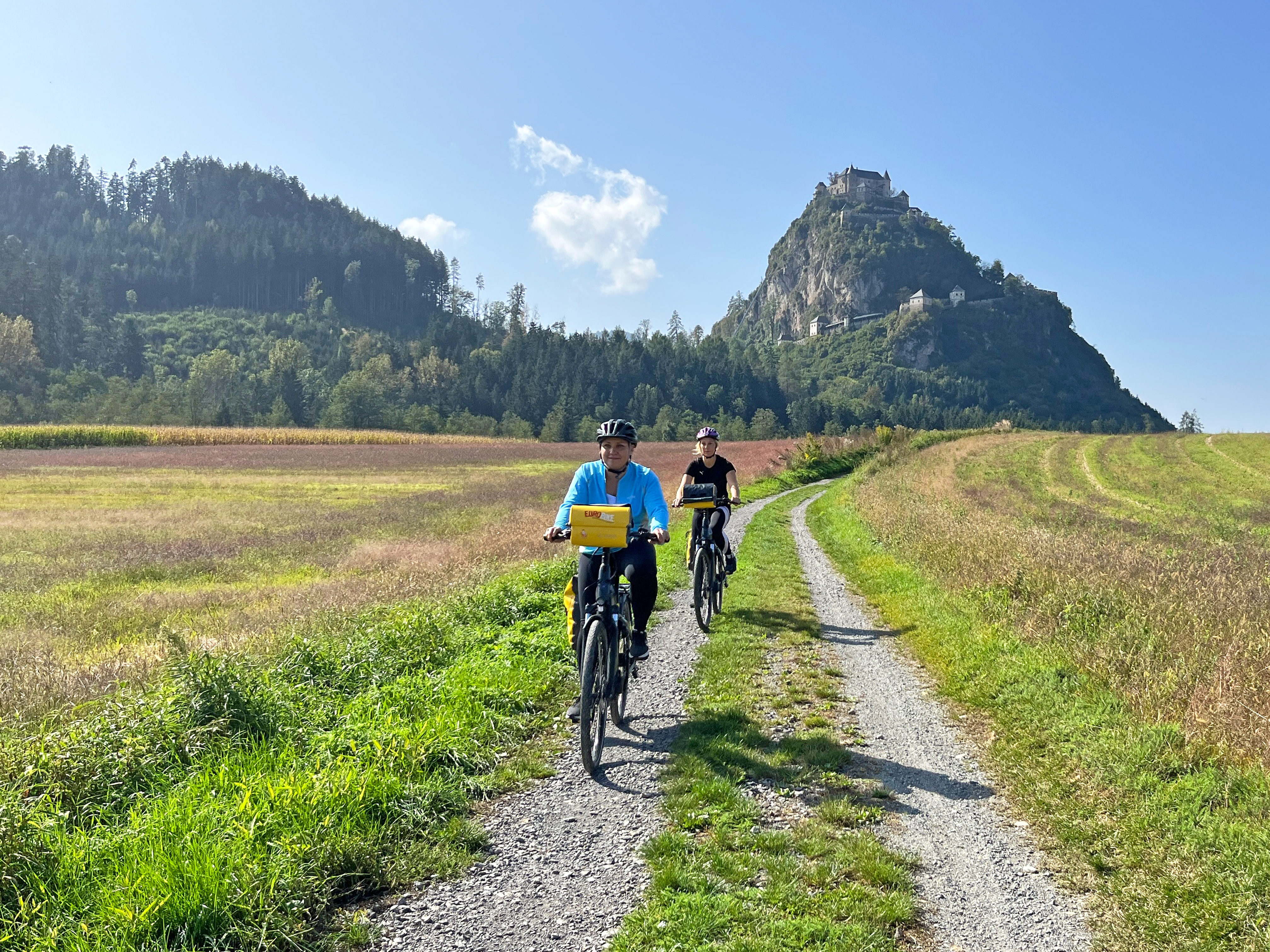 <Vom Klopeiner See radeln Sie zurück an den Völkermarkter Stausee und über den Glan-Gurk-Radweg in die Herzogstadt Völkermarkt, der Hauptstadt des Jaunatals. Herrliche Ausblicke auf die Kärtner Landschaften begleiten Sie zur Burg Hochosterwitz. Es ist schon erstaunlich, was die Natur erst und die Menschen später dort vollbracht haben. Mitten auf dem Feld steht ein 150 Meter hoher Kalkfelsen, der nach allen Seiten steil abfällt und zu einer uneinnehmbaren Festung ausgebaut wurde. Zahlreiche Burgen und Schlösser in der Umgebung erinnern an die frühere Bedeutung der einstigen Landeshauptstadt St. Veit.