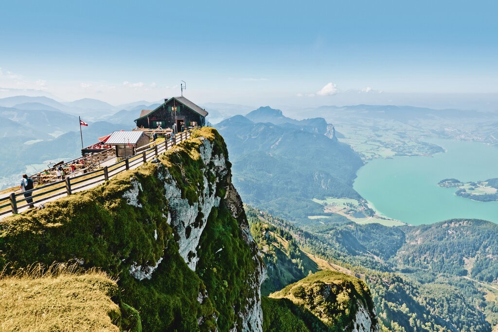 <Mit dem Schiff geht es nach St. Wolfgang. Auf Ihrer Wanderung entlang des Höhenweges zur Falkensteinwand genießen Sie den Blick auf den See. Auf dem romantischen Seeuferweg spazieren Sie ins Mozartdorf St. Gilgen. Rückfahrt mit dem Schiff. -