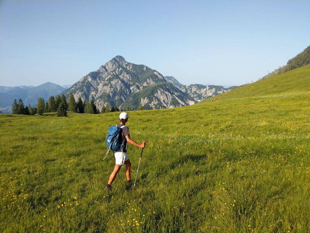 <Erfreuen Sie sich des Almlebens: Wandern Sie zur Nachbaralm Moosangerl oder Gruberalm, besteigen Sie einen Aussichtspunkt und probieren Sie die berühmten „Pofesen“. Felsige Gipfel, aussichtsreiche Kammwege und einfache Almenwege laden zu gemütlichen oder ausgiebigen Touren ein. -