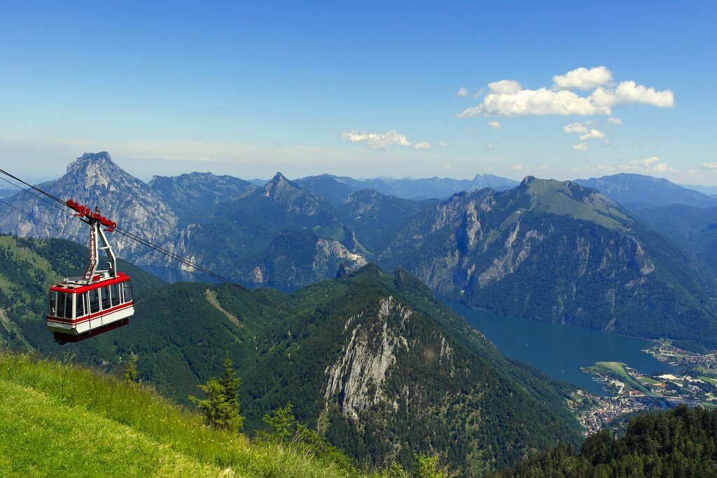 <Zum südlichen Ende des Traunsees, ins Tal nach Ebensee, erfolgt die Fahrt mit Seilbahn. Die Ebenseer Bucht am Südufer des Traunsees bietet in der warmen Jahreszeit optimale Bedingungen für Wassersportfreunde. Während eines Spaziergangs durch den Ort zurück zum Ausgangspunkt der Reise kann man einem kleinen Spektakel beiwohnen und den Surfern bei ihren Kunststücken zuzuschauen. Für all diejenigen, die noch mehr Zeit im Salzkammergut verbringen wollen, gibt es viel zu entdecken; andernfalls erfolgt heute die individuelle Abreise.