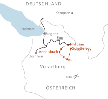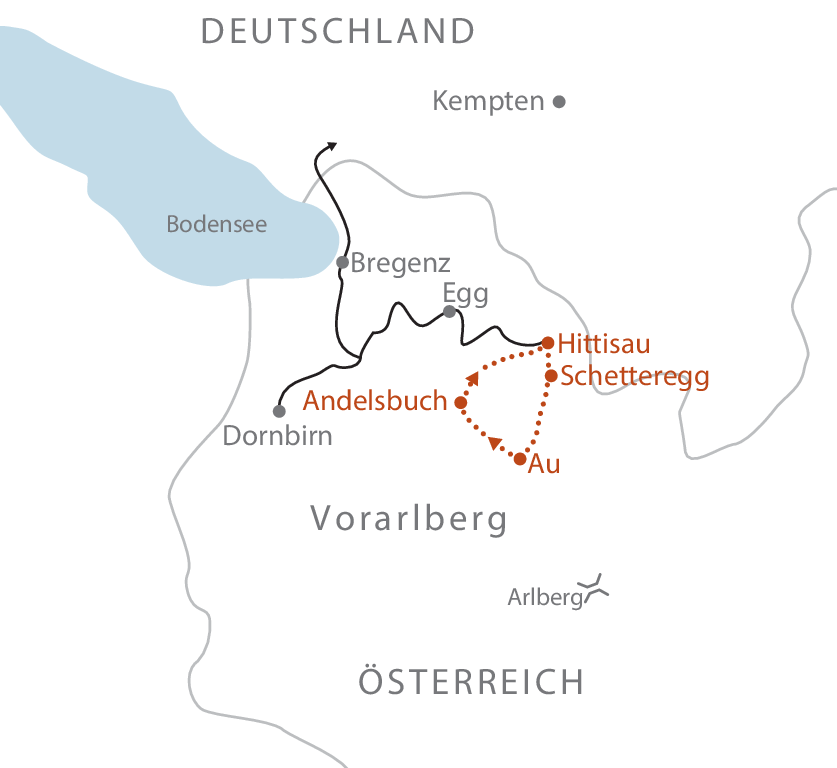 Bis Bhf. Dornbirn oder Bregenz, jeweils mit den öffentlichen Bus weiter nach Hittisau (von Dornbirn aus etwas kürzer). Ein Transfer zum ersten Hotel kann auf Anfrage organisiert werden (nicht im Reisepreis inkludiert).
