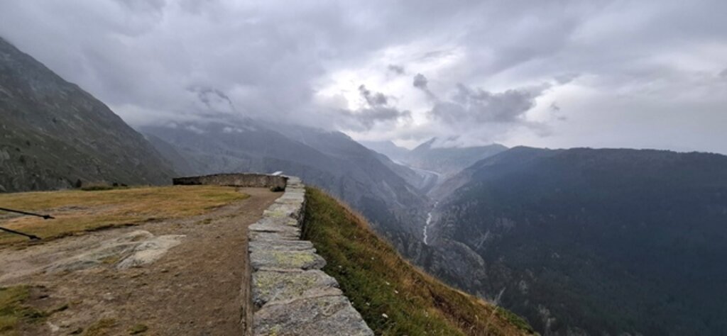 <Mit dem Zug von Brig zurück nach Ausserberg. Suonen und das Bahntrassee der BLS begleiten diese Etappe. Eindrücklicher Blick auf das Baltschieder-Viadukt. Rohre zur Bewässerung der trockenen Südhänge säumen den Weg. Infosäulen zur BLS Südrampe und das Museum der Schweizer Garde bieten spannende Informationen. Ab Naters entweder zu Fuss oder mit dem Bus nach Blatten und von dort mit der Seilbahn hoch zur Belalp.