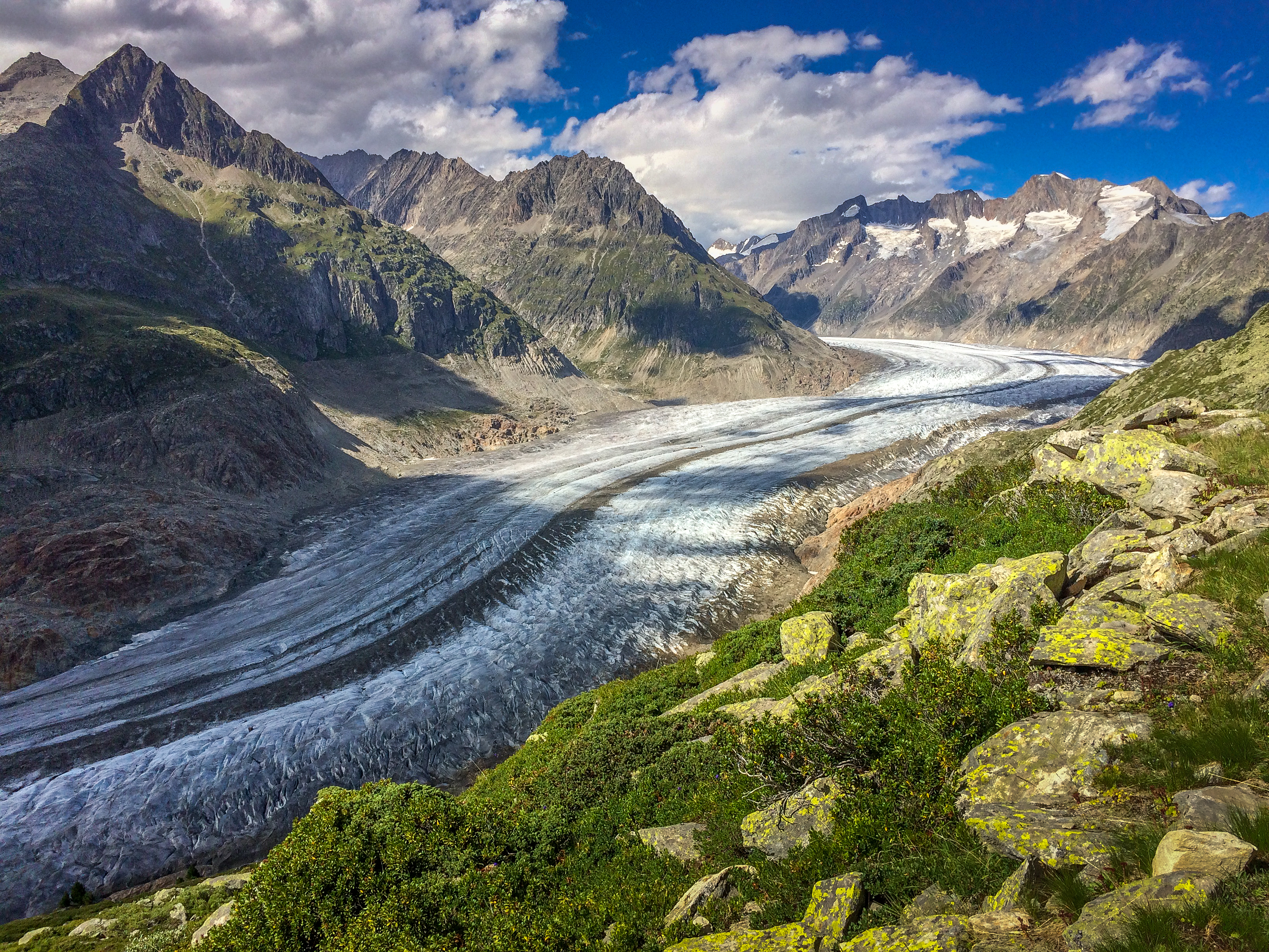 <Einem Feuerwerk ähnlich folgen sich einmalige Aussichtpunkte: Im Norden ein herrlicher Blick auf den Aletschgletscher, das Herz des UNESCO-Welterbes, und im Süden auf die Walliser Viertausender. Sanfter Abstieg zum Märjelensee. Wollgräser und kleine Seen bilden Kontraste zu Fels und Eis.