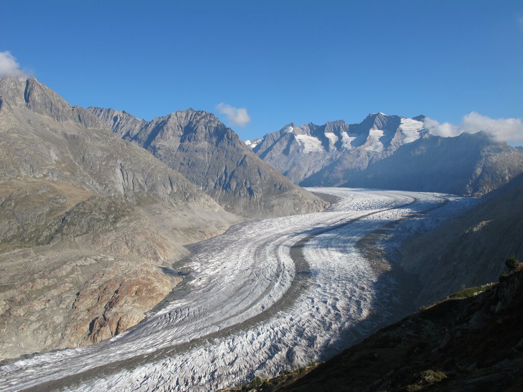 <Einem Feuerwerk ähnlich folgen sich einmalige Aussichtpunkte: Im Norden ein herrlicher Blick auf den Aletschgletscher, das Herz des UNESCO-Welterbes, und im Süden auf die Walliser Viertausender. Sanfter Abstieg zum Märjelensee. Wollgräser und kleine Seen bilden Kontraste zu Fels und Eis. Zum Schluss der Tour durch den Tälligrattunnel zur Fiescheralp.