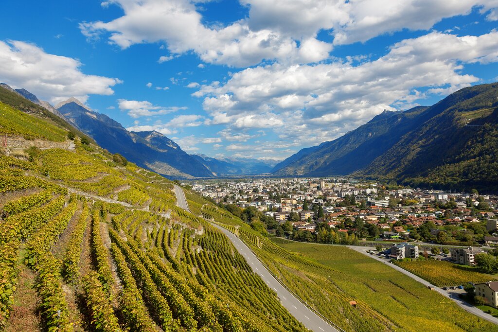 <Die Hauptstadt Sion zeigt ihre historischen Burgen, Kirchen und Herrenhäuser. Im unteren Rhonetal dominiert der Dents-du-Midi die Hochalpen-Kulisse. Es ist die Welt der ertragreichen Obstgärten und Weinberge.