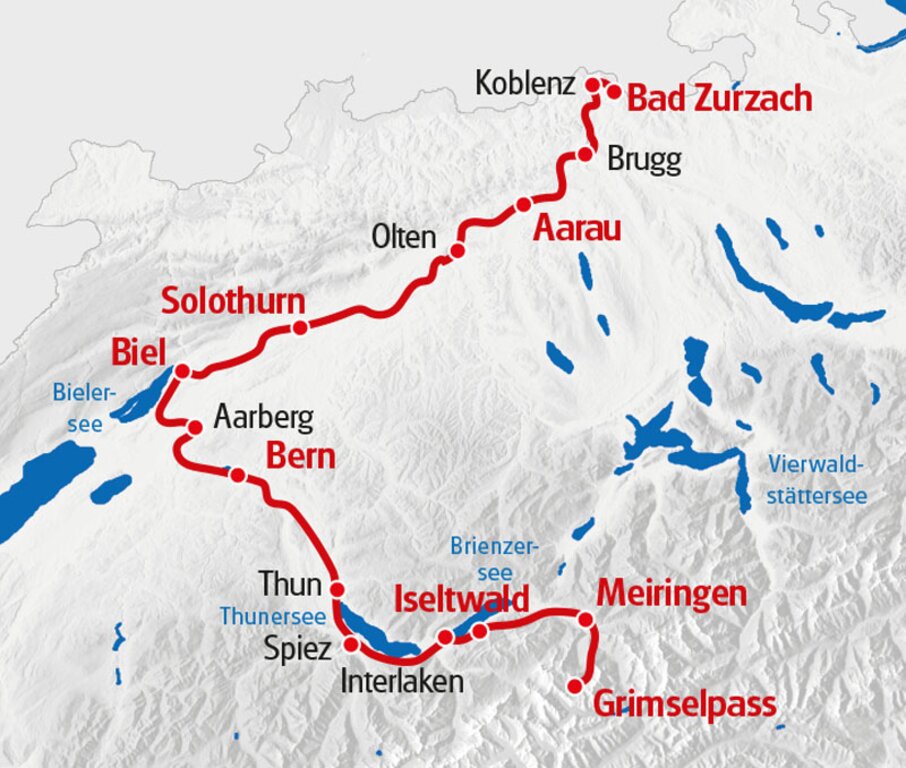 Der Klassiker im Veloland Schweiz: Lernen Sie entlang der Aare ein Stück Schweiz kennen, das den Charme der Provinz, des Bauerntums, der unverfälschten Natur bis in unsere Tage bewahrt hat. Besuchen Sie unser Land und seine Bewohner sozusagen «durch die Hintertüre» - nicht durch den Vordereingang mit all den touristischen Klischees.