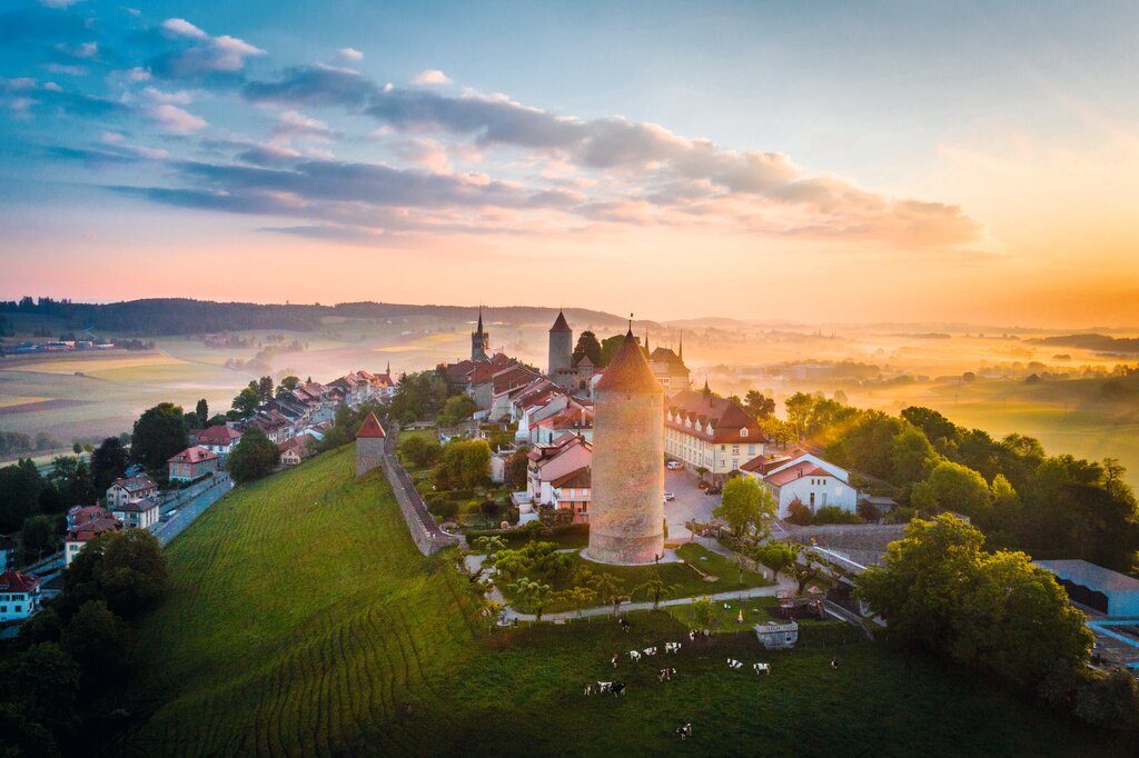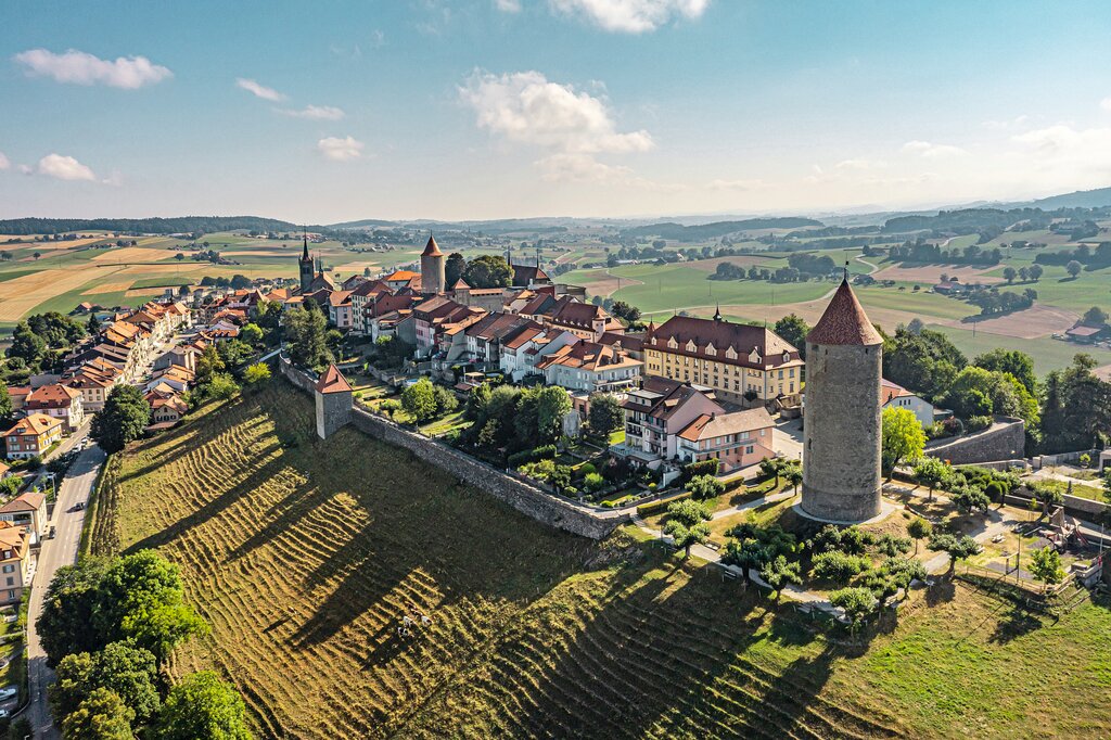 <Nach Romont bietet die Route eine grosse Fülle an Eindrücken und berührt sowohl voralpines Hügelland als auch das Drei-Seen-Land mit den historischen Städtchen Avenches und Murten.