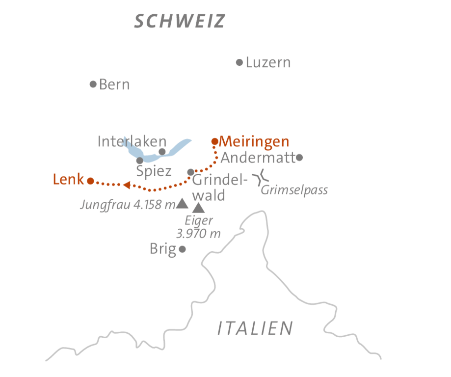 Entdecken Sie die alpine Schweiz von ihrer schönsten Seite: Am Bärentrek sind Sie auf einer einzigartigen Route über spektakuläre Pässe und entlang grandioser Gletscher unterwegs. Die Via Alpina führt Sie durch Täler und Schluchten, vorbei an den drei „stolzen Schweizern“ Eiger, Mönch und Jungfrau bis in den Schweizer Ferienort Adelboden-Lenk. Bären werden Sie zwar mit größter Wahrscheinlichkeit nicht begegnen, da diese Trekkingtour den Namen der Zeit verdankt in der die Strecke nur von wilden Tieren passiert werden konnte. Doch auch heute ist der Bärentrek kein Spaziergang, da es einige Pässe zu überqueren gilt. Auf den Höhen und Gipfeln werden Sie jedoch für Ihren alpinistischen Einsatz belohnt. Lassen Sie die vollkommene und imposante Schönheit der Alpen auf sich wirken.