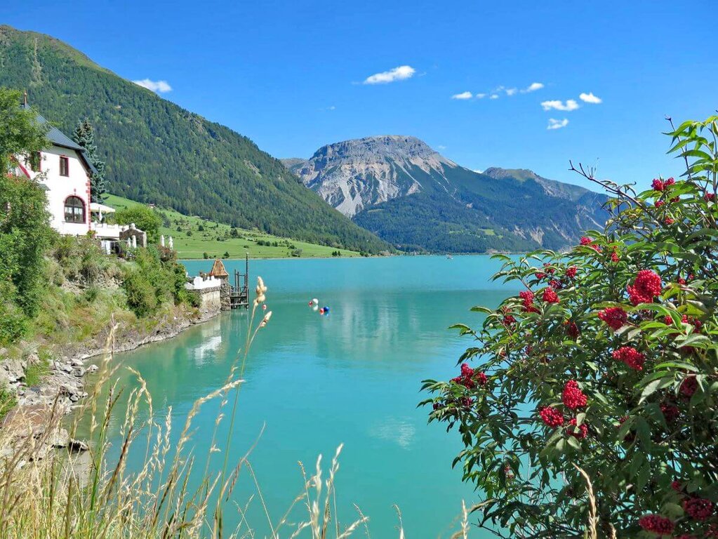 <Von Scoul über Martina an die Grenze. Das erste österreichische Dorf Pfunds. Von hier Transfer per Bus nach Nauders. Knapp 70 Höhenmeter bleiben hinauf zum Reschenpass. Abfahrt an den Reschensee und weiter auf Nebenwegen nach Mals (vieltürmiger Ortskern) oder Burgeis am Fuße der Marienburg. -