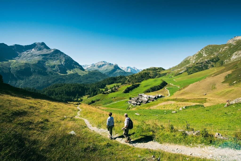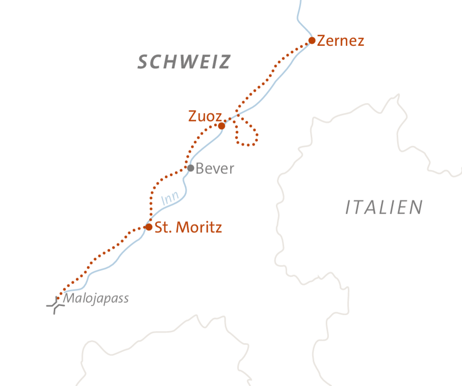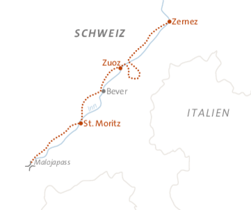Über 800 Gletscher speisen den Inn, der am Malojapass seinen Anfang nimmt. Auf malerischen Höhenwegen folgt die Via Engiadina dem Lauf dieses Flusses. Sie passieren Silvaplana und St. Moritz und bestaunen die strahlenden Gletscher der nahen Bernina-Gruppe. Die touristischen Zentren lassen Sie bald hinter sich und Sie wandern durch verträumte Bergdörfer hin zur unberührten Berglandschaft des Schweizer Nationalparks. Seit mehr als 100 Jahren nimmt die Natur in der südöstlichsten Ecke der Schweiz ungestört ihren Lauf und so folgen Sie der Via Engiadina durch eine Berglandschaft die ihresgleichen sucht.