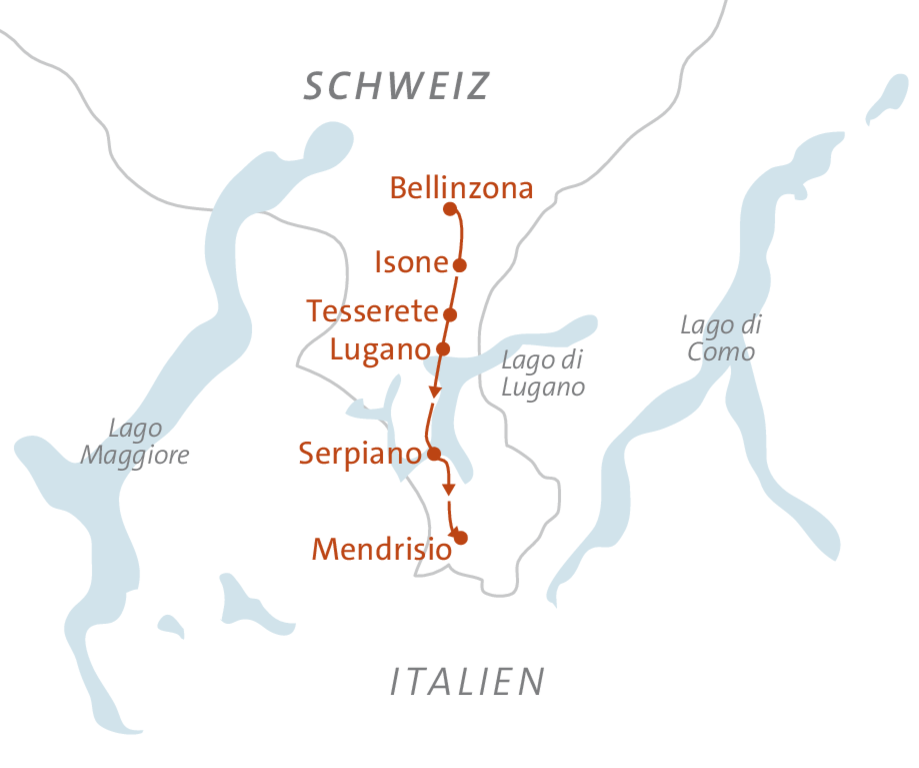 Die Täler sind einsam, die Höhenwege aussichtsreich und die Städte strotzen nur so vor Lebenslust und Italianità. Diese Wanderreise führt Sie durch die südlichste Ecke der Schweiz von den erhabenen Burgen Bellinzonas durch das quirlige Lugano und weiter nach Mendrisio. Unterwegs erwarten Sie kleine, traditionelle Dörfer mit typischen Grotti. Hier werden lokale Spezialitäten serviert und Gäste mit Charme bedient. Die Ausblicke auf die vielen Seen in dieser Region begleiten Sie auf Ihrem Weg zu den Höhepunkten des Tessins.