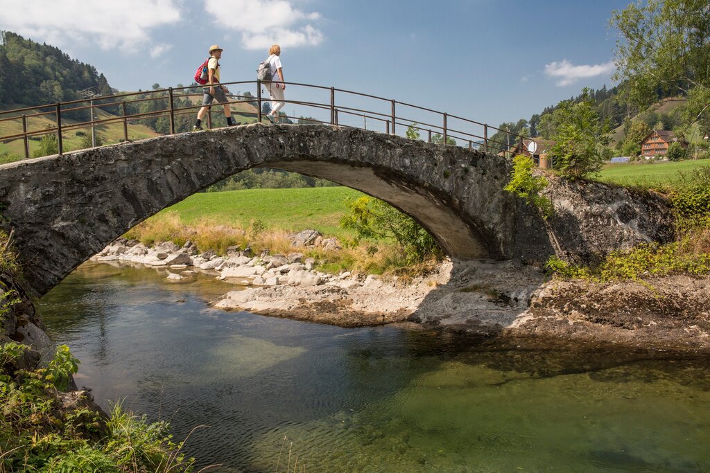 <Prächtige Wanderung nach Lutertannen und über den Aussichtspunkt Risipass nach Stein im Toggenburg. Wiesen und Alpweiden, naturnahe Flachmoore und Nadelwälder wechseln sich in bunter Folge ab.