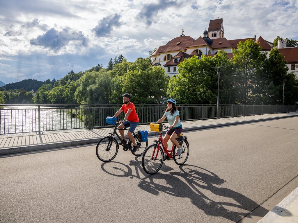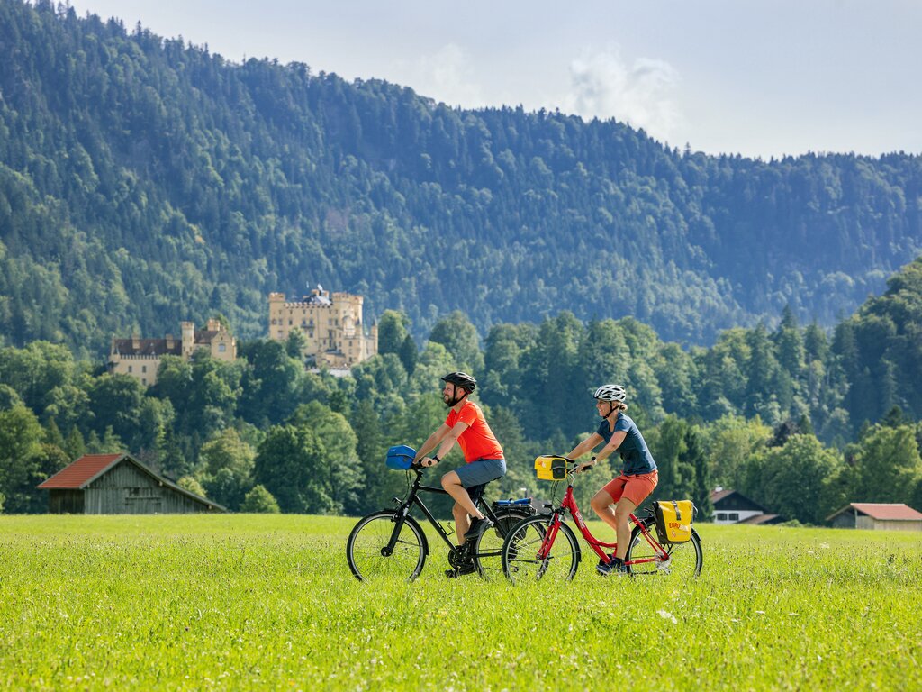 <Eine beeindruckende Bergkulisse begleitet Sie nach Füssen am Forggensee. Sehenswert ist hier neben den landschaftlichen Eindrücken das Hohe Schloss, in dem die Staatsgalerie beheimatet ist. Einen Besuch lohnt auch das Benediktinerkloster Sankt Mang. Mit Blick auf die Allgäuer Alpen radeln Sie weiter an der Romantischen Straße entlang nach Schwangau. Bereits von weitem werden in der Ferne die malerischen Königsschlösser Neuschwanstein und Hohenschwangau sichtbar.