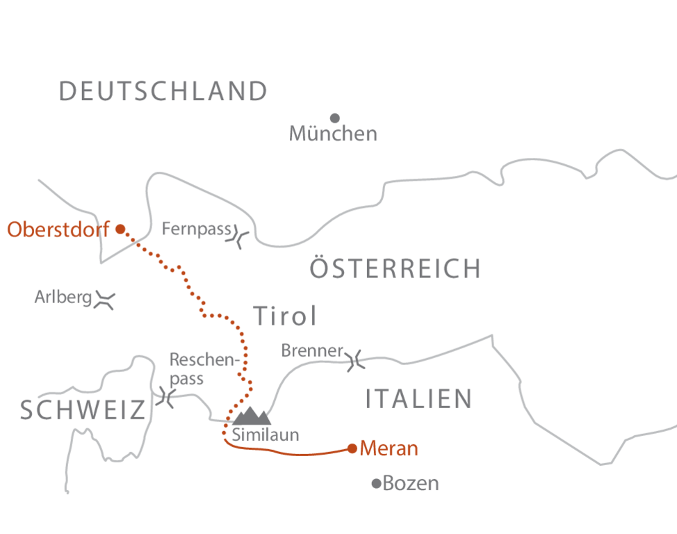 - PKW: Steht dein Auto in Oberstdorf, bietet sich die Rückreise mit dem Shuttle-Bus unseres Partners an. Der Transfer erfolgt um 8:00 Uhr ab Bahnhof Meran bis Oberstdorf und ist auf Anfrage bei uns buchbar - bitte bei Buchung angeben.