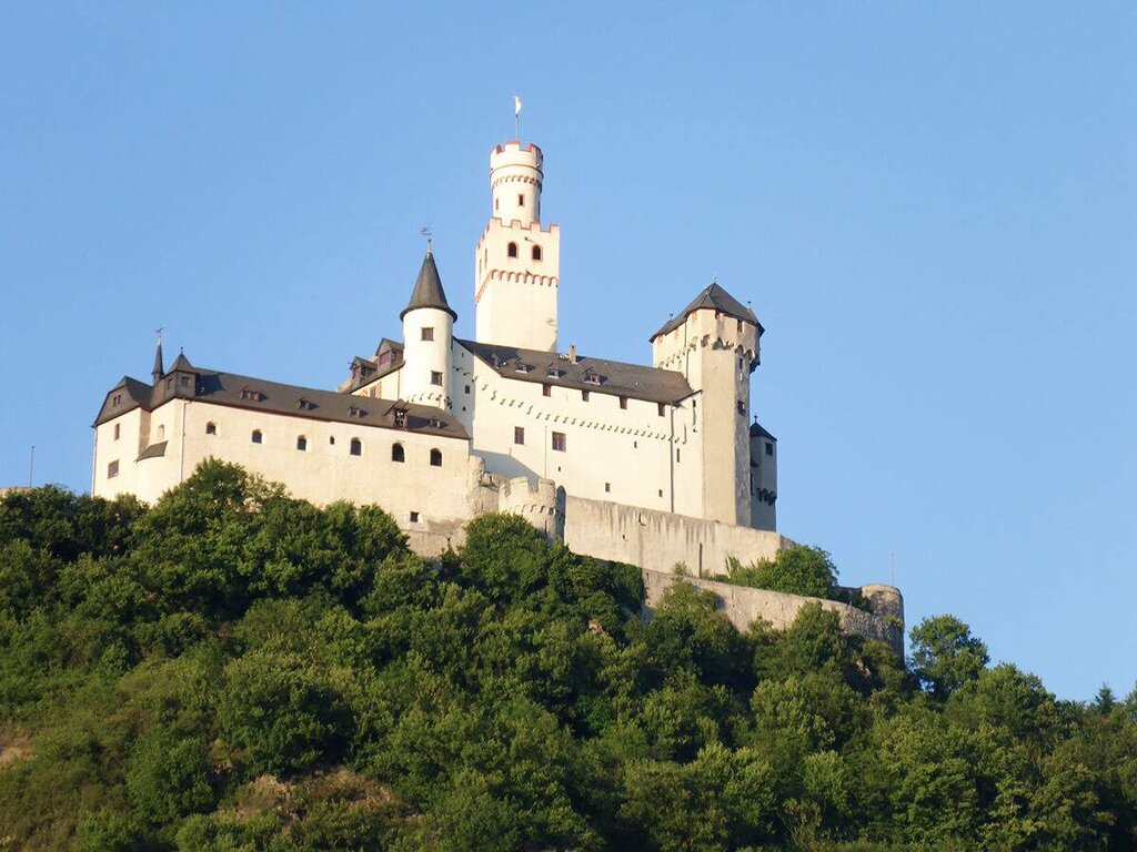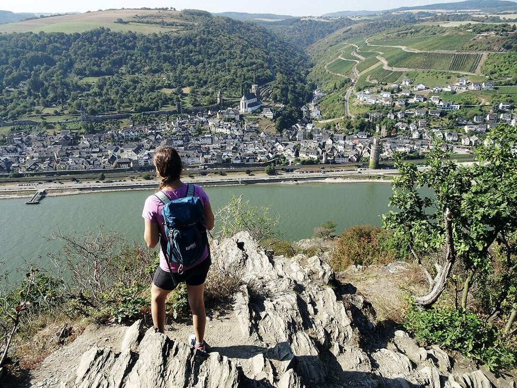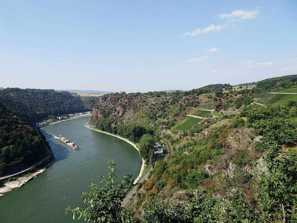 <Das Herz des Mittelrheintals erwartet Sie mit verschlungenen Pfaden, traumhaften Ausblicken und sagenhafte Burgen. Der berühmteste Felsen am Rhein, der Loreley-Felsen steht ebenfalls auf Ihrem Programm, sowie der Dreiburgenblick auf Burg Katz, Maus und Rheinfels. Ein krönender Abschluss Ihrer Tagesetappe, bevor Sie St. Goarshausen erreichen. -