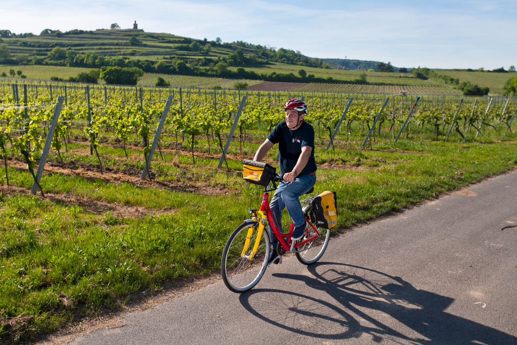 Überwiegend in ebenem Gelände. Lediglich in den Weinbergen zwischen Worms und Bad Dürkheim gibt es kleinere Steigungen.