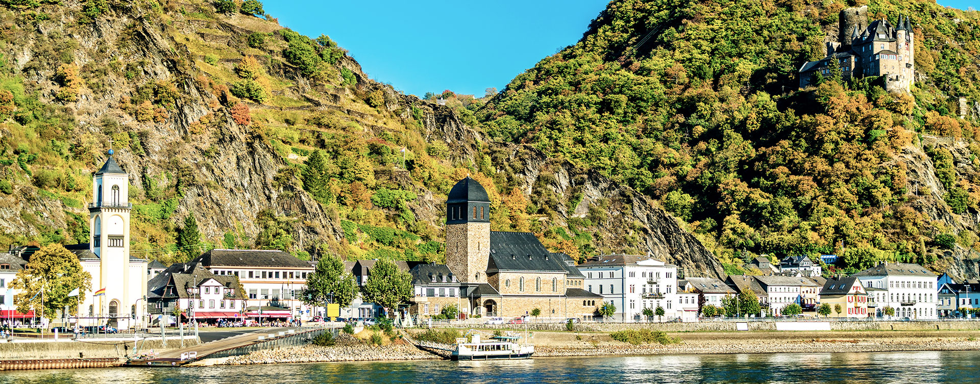 <Das Herz des Mittelrheintals erwartet Sie mit verschlungenen Pfaden, traumhaften Ausblicken und sagenhafte Burgen. Der berühmteste Felsen am Rhein, der Loreley-Felsen steht ebenfalls auf Ihrem Programm, sowie der Dreiburgenblick auf Burg Katz, Maus und Rheinfels. Ein krönender Abschluss Ihrer Tagesetappe, bevor Sie St. Goarshausen erreichen. -