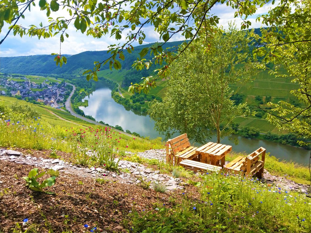<Schöne Pfade führen Sie hoch über dem Fluss bis auf den Petersberg, wo das Gipfelkreuz imposante Tiefblicke auf die Moselschleife bietet. Nach dem Abstieg und der Flussüberquerung bei Neef erklimmen Sie auf der anderen Seite den Calmont. Sie entdecken den steilsten Weinberg Europas, wo die Weinbaulagen bis 55° Neigung haben. Über eine römische Höhensiedlung mit Blick zur Felsnadel der „Eller Todesangst“ steigen Sie am Galgenlay- Pavillon vorbei und per Bahn nach Cochem.