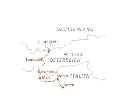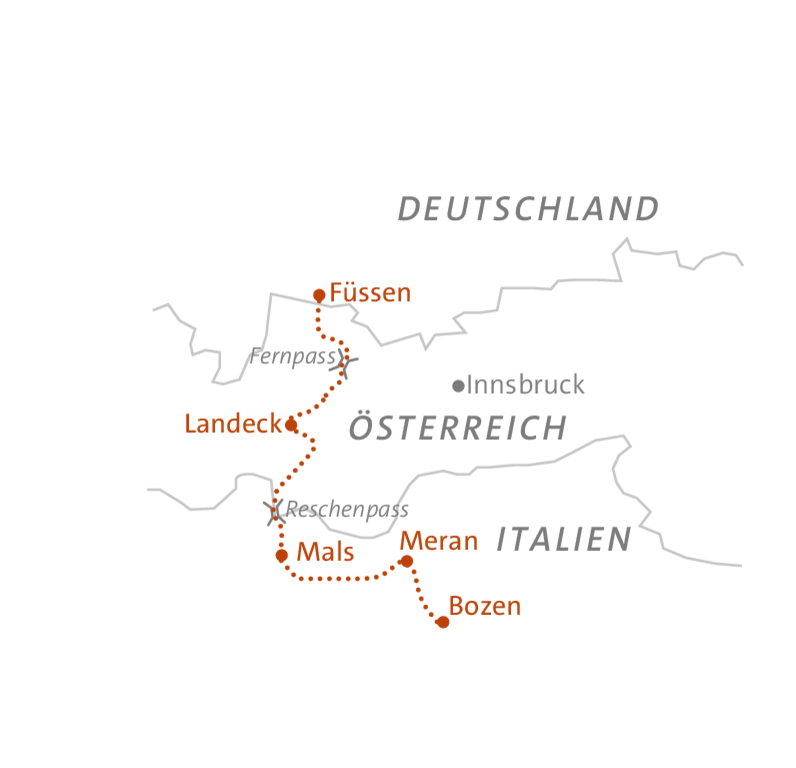 In Füssen, am Fuße des Ammergebirges und idyllisch am Forggenstausee gelegen, beginnt Ihre transalpine Radreise. Vorbei am Füssener Lechfall folgt der Radweg dem naturbelassenen Lech-Fluss in die Tiroler Alpenwelt. Die schroffe Eleganz der Lechtaler Alpen und des Zugspitzmassivs flankieren den Radweg bis ins Erwalder Becken, ein geschützes Moorgebiet, in dessen Untergrund Teile einer römischen „Prügelstraße“ der Via Claudia Augusta konserviert liegen. Ab Biberwier bringt Sie ein organisierter Transfer bis zum Schloss Fernsteinsee und der Radweg treibt Sie schwungvoll durch das malerische Gurgltal ins Obere Inntal bis Landeck. Ein sportlicher, serpentinenförmiger Anstieg von ca. 700 Höhenmeter erwartet Sie zwischen Pfunds und Nauders am Reschenpass. Ab dem Reschensee in Südtirol führt der Etschradweg entlang des verspielten Flusses durch die üppigen Vinschgauer Obst-Kulturlandschaften in die Kurstadt Meran. Südliches Flair versprühen die Weingärten, die sich in schwungvollen Linien rund um den Kalterer See an die Landschaft schmiegen und das Biotop idyllisch in ihrem Schoß tragen. In der temperamentvollen Handelsstadt Bozen könnten Sie Ihre Radreise bei einem gemütlichen chill-out Aperitif am Waltherplatz Revue passieren lassen.
