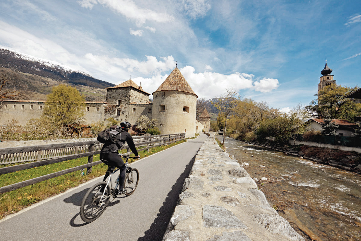 <Nun gilt es, den gesamten Vinschgau zu durchqueren. Dabei führt der Weg von rund 1.200 m Seehöhe in Burgeis hinunter auf 350 m Seehöhe in Meran. Oft folgen Sie dabei direkt dem Lauf der Etsch. Vom Startort aus führt diese Genusstour zunächst hinunter in die kleinste Stadt des Alpenraumes nach Glurns. Über den Marmorort Laas erreichen Sie dann Naturns und schließlich – vorbei an der markanten Burg Kastelbell – die Kurstadt Meran. Entspannen Sie sich hier bei einem abendlichen Rundgang an der Passerpromenade inmitten einer subtropischen Pflanzenwelt.