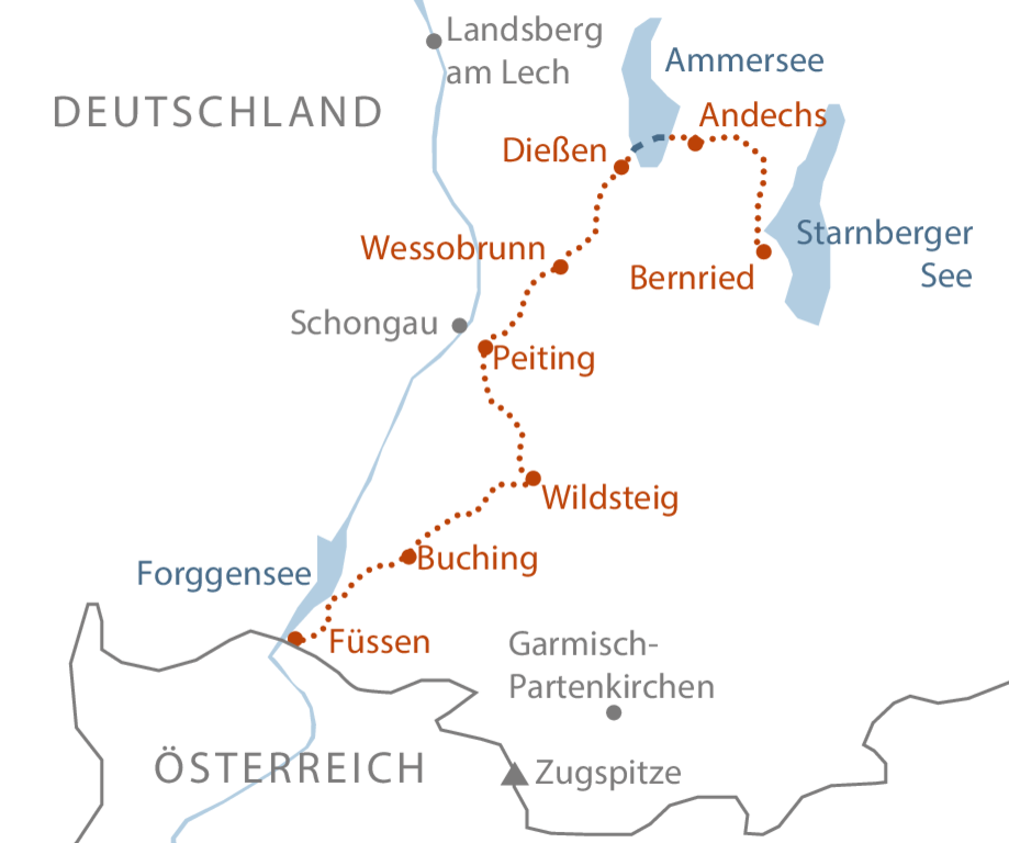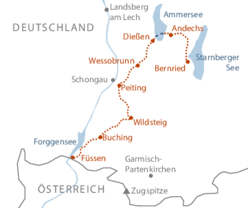 Durch das traumhafte Alpenvorland führt der König-Ludwig-Wanderweg vom idyllischen Starnberger See, wo der Märchenkönig seinen tragischen Tod fand, bis hin zu den Schlössern im Allgäu, in denen er seine Jugend verbrachte. Vorbei an bemerkenswerten Sehenswürdigkeiten und bayerischen Kulturgütern wandern Sie durch eine Landschaft, die schon der bayerische Herrscher König-Ludwig II. ganz besonders liebte und ihn bei der Errichtung seiner Schlösser inspirierte. Traumhafte Wanderungen durch Klosterorte, beschauliche Dörfer, vorbei an Seen und Moorgebieten erwarten Sie. Genießen Sie beeindruckende Weitblicke auf die Ammergauer Alpen, die Zugspitze und die Allgäuer Berge wie es einst auch König Ludwig getan hat.