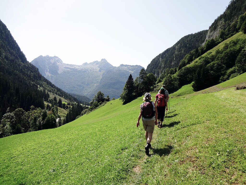 <Transfer zum Startpunkt. Gemütliche Wandertour vorbei am Hintersee tief hinein in den Nationalpark. Beeindruckend ist die Szenerie entlang des Weges. Rechts von Ihnen befinden Sich die Gipfel der Reiter Alpe und links die der Hochkalterer. Über Almen geht es vorbei an der Grenzstation am Hirschbichl und hinunter durch die brausende Seisenbergklamm ins Saalachtal. -