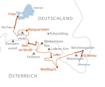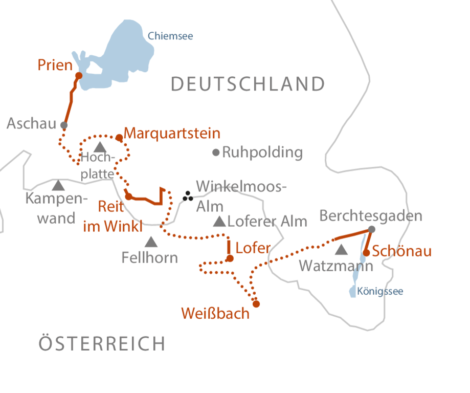 Im Grenzgebiet Salzburg, Tirol und Bayern liegen die Chiemgauer Alpen mit ihren sanften Bergen, großflächigen Almlandschaften und bekannten Ferienorten. Die Ausblicke auf die imposanten Hohen Alpen und auf der anderen Seite ins liebliche Alpenvorland, machen diese Reise zu einer sehr abwechslungsreichen Wanderwoche. Zu den schönsten Plätzen entlang dieser Tour zählen sicherlich zu Beginn der malerisch gelegene Königssee, der idyllische Ferienort Reit im Winkl und zum Abschluss der Chiemsee auch genannt das „bayerische Meer“.