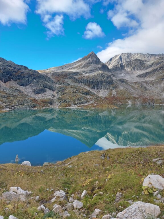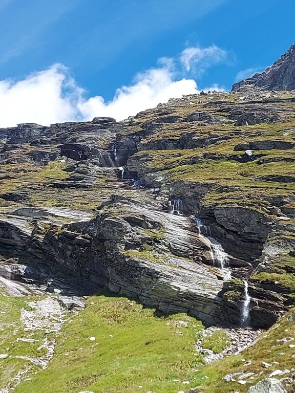 <Der höchste Punkt der heutigen Wanderung ist schnell erreicht. Am Kalser Törl auf 2.515 Metern überschreitest du die Grenze vom Salzburger Land nach Tirol und blickst auf eine beeindruckende Bergwelt. Der Abstieg ins Dorfertal beginnt steil, über schmale Steige und tiefe Stufen. Nach einiger Zeit geht er dann in einen wunderschönen Weg über, an Bergflanken entlang und über das Felsblockgelände am Dorfersee.