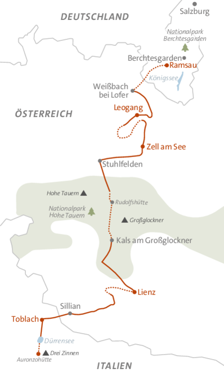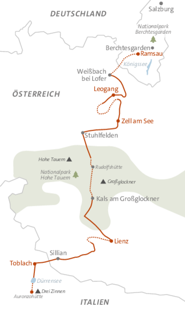 Nationalpark Berchtesgaden, Hohe Tauern und Naturpark Drei Zinnen – Namen, die nach Abenteuer klingen und für unvergessliche Alpenmomente stehen. Auf dieser Trekkingreise erlebst du täglich neue Perspektiven: mal aussichtsreiche Höhenwege, mal eindrucksvolle Überschreitungen, die dich Schritt für Schritt weiter nach Süden führen. Ein Höhepunkt erwartet dich auf 2.300 Metern: Im traditionsreichen Berghotel Rudolfshütte schläfst du unter funkelndem Sternenhimmel und spürst die Kraft der Berge ganz nah. Mit dieser komfortablen Variante des Klassikers „Königssee – Drei Zinnen“ verbindest du das intensive Gefühl einer echten Trekkingtour mit der Leichtigkeit des Gepäcktransports. Abends genießt du die Gastfreundschaft ausgewählter Gasthöfe und Hotels, um am nächsten Morgen erholt und voller Energie in ein neues Abenteuer aufzubrechen.