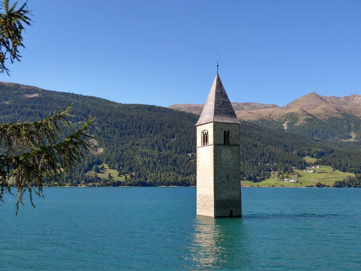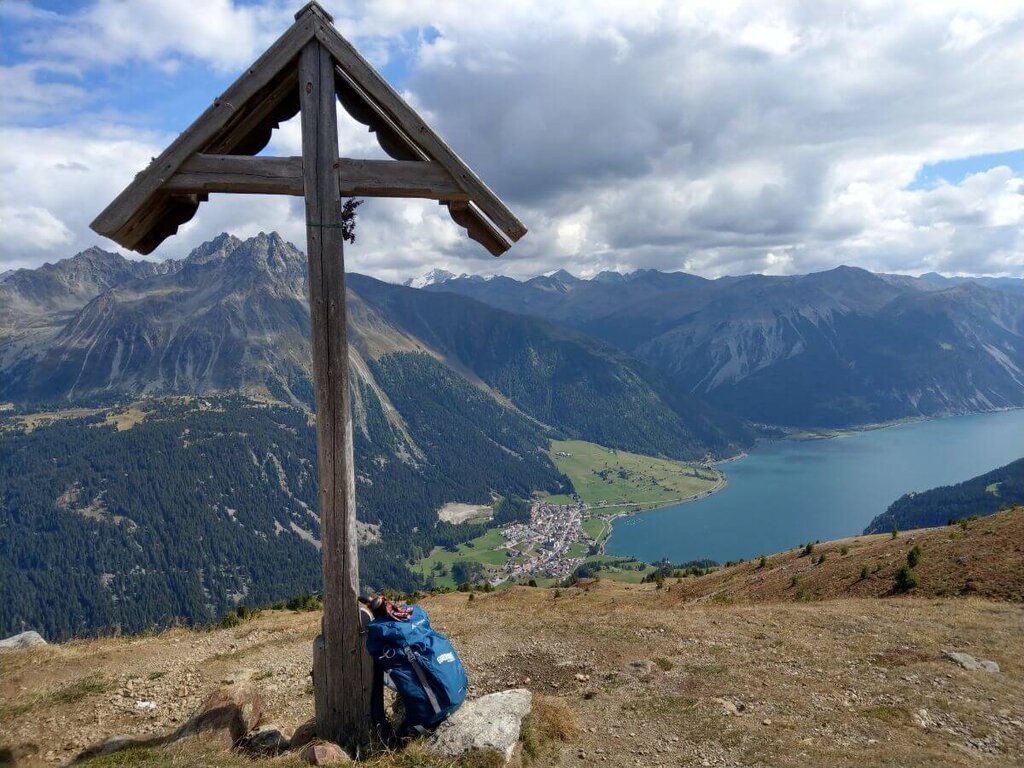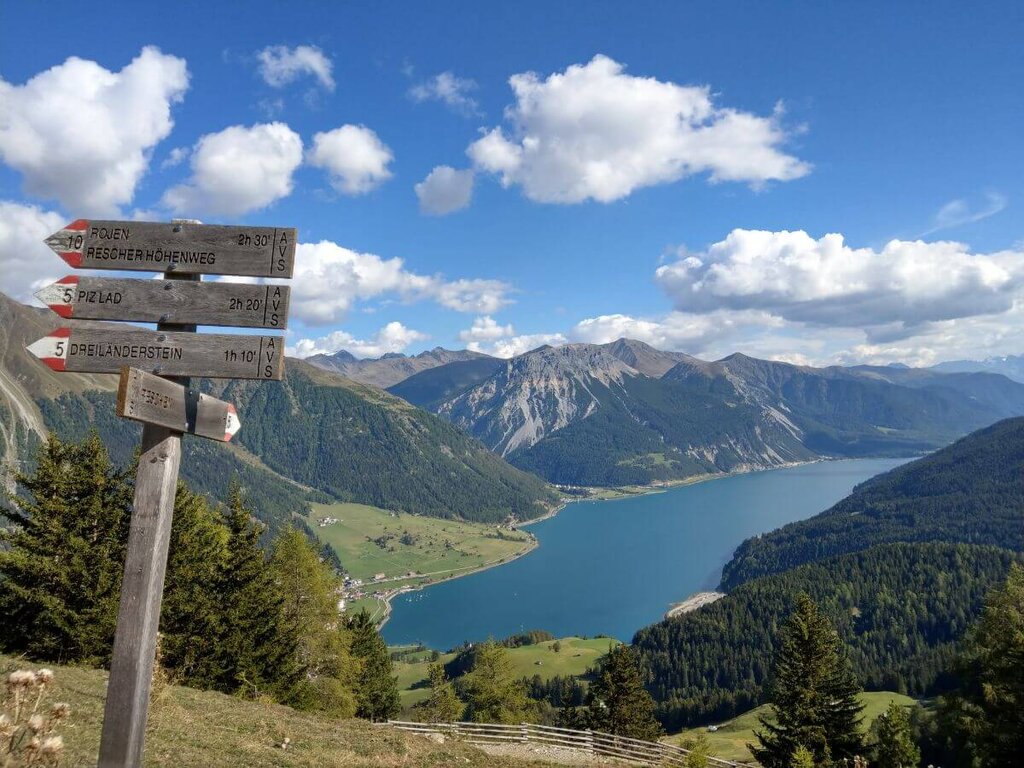 <Per Seilbahn gelangen Sie zum Mutzkopf, wo Sie Ihre Wanderung zum Schwarzsee und Grünsee starten. Sie steigen hinauf bis zum Dreiländergrenzstein, um dort genau auf der Grenze zwischen Italien, Österreich und der Schweiz zu stehen. Über die Almen geht es hinab zum riesigen Reschensee, in dessen gleichnamigen Hauptort Sie heute zu Gast sind. Willkommen in Italien!