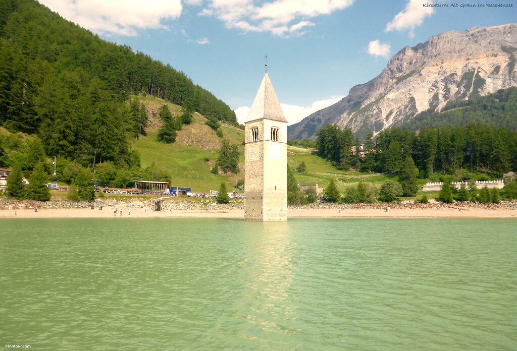 <Neben dem Inn führt der Radweg ab Landeck entlang des sogenannten Oberen Gerichts zunächst bis Pfunds. Hinter Pfunds liegt die Strecke ca. 10 Kilometer auf Schweizer Staatsgebiet. Von Martina im Unterengadin aus gilt es ca. 400 Höhenmeter entlang von ein paar Serpentinen bei stets gut bewältigbarer Steigung hinauf bis zur Norbertshöhe zu radeln. Nach einer kurzen Bergabpassage hinunter nach Nauders führt ein sanfter Anstieg weiter hinauf zum Reschenpass, wo Sie die Grenze nach Italien und damit den Alpenhauptkamm überqueren. Vorbei am Reschenstausee mit einem der bekanntesten Fotomotive Südtirols – dem versunkenen Kirchturm von Altgraun – radeln Sie rasant weiter hinunter Richtung Mals. Genießen Sie den ersten Abend in Südtirol in den alten Gässchen des Ortes. -