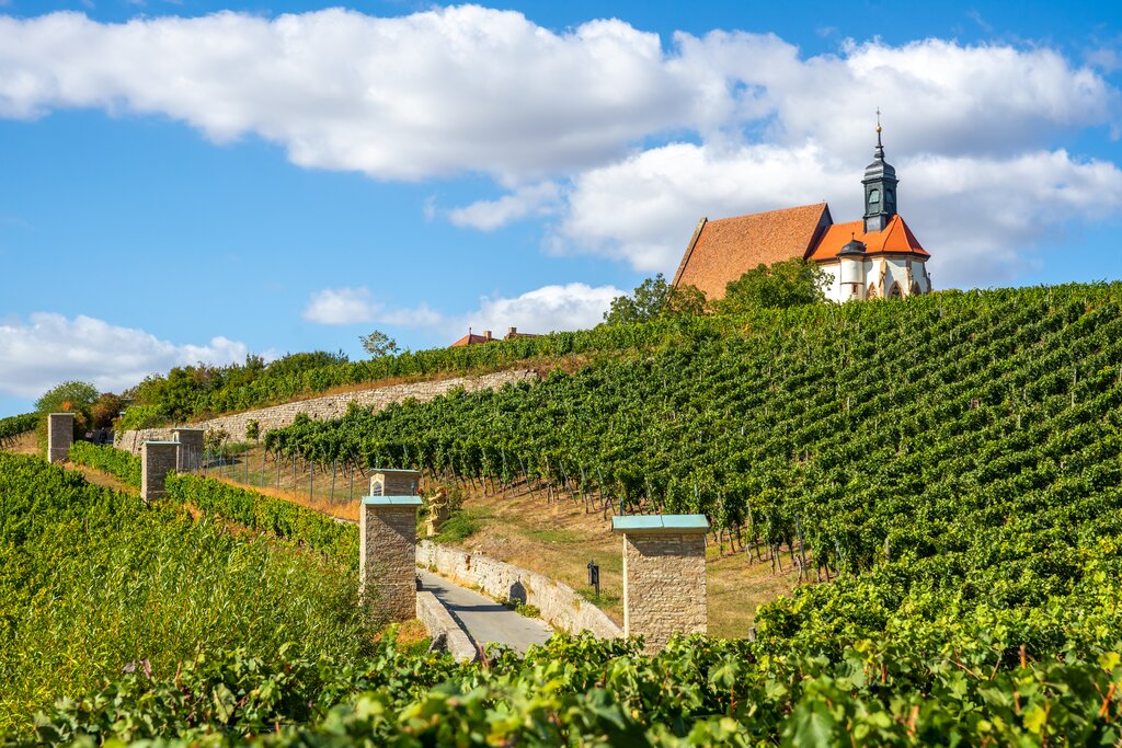 <Ein kurzes Stück folgen Sie am Morgen zunächst der Regnitz bis zum Main, der Sie zur sehenswerten Wallfahrtskirche Maria Limbach führt. Jetzt beginnen die ersten Weinberge, die die Grenze zwischen Bier- und Weinfranken markieren. Lassen Sie in Schweinfurt einen sonnigen Radeltag ausklingen.