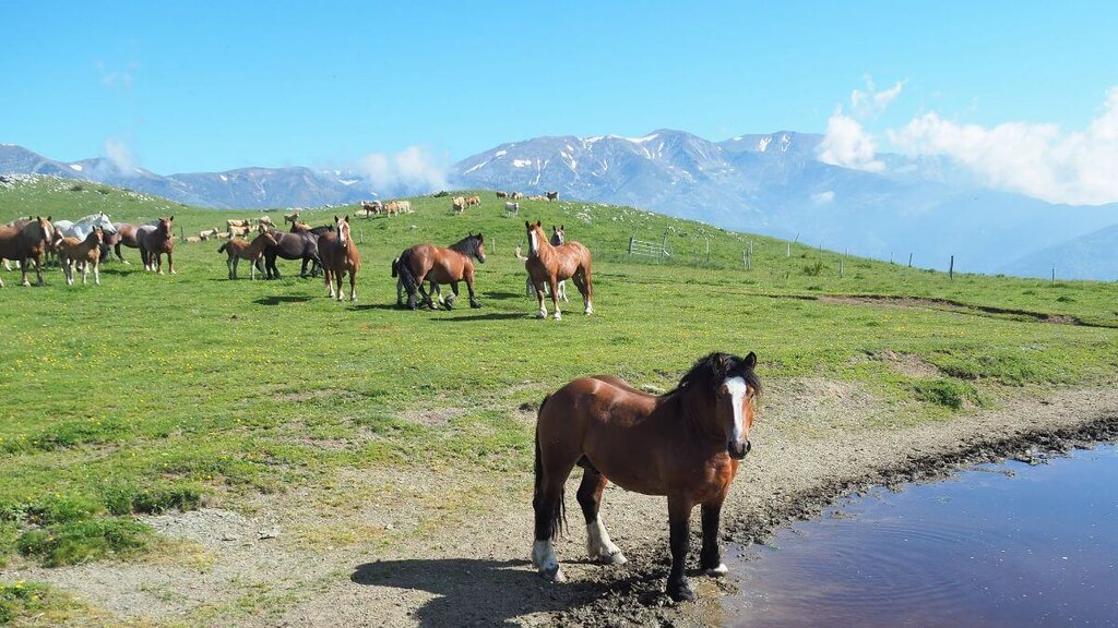 <Heute erreichen Sie Bergwiesen, auf denen nur noch wilde Pferde und Kühe leben. Die Einheimischen nennen diese Gegend angesichts ihrer schroffen Natur und der herben Wildheit liebevoll „Die kleine Mongolei“ der Pyrenäen, und das nicht zu Unrecht. Durch Birkenwälder und nur begleitet vom Plätschern der Bergquellen geht es abwärts zum fesselnden Dorf Sant Joan de les Abadesses. -