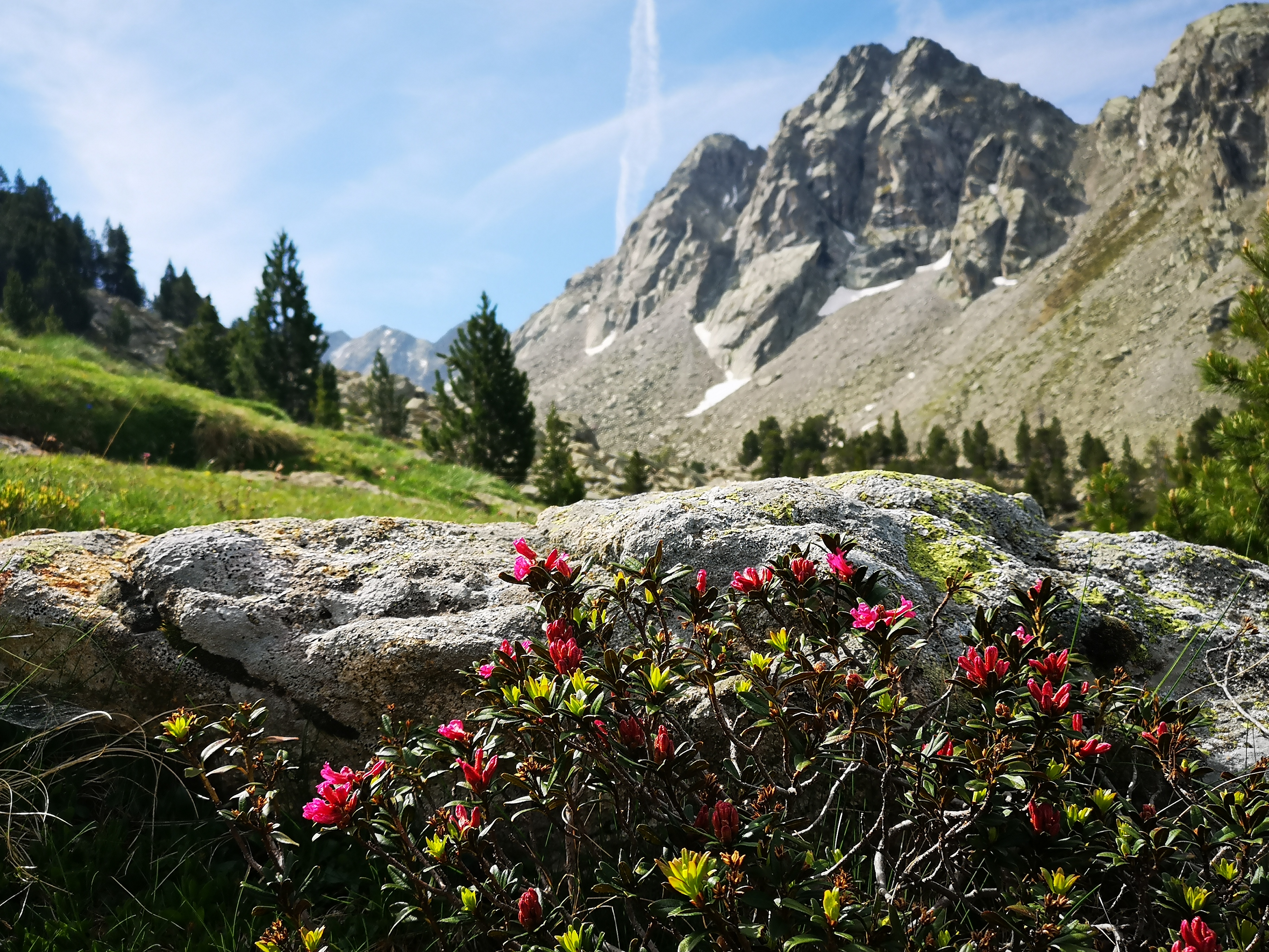 <Von Taüll aus machen Sie einen hin- und zurück Spaziergang über den hohen Kamm oberhalb des Dor fes ; der sogenannte “Pala de Taüll”. Ihr erster Ha t auf der Route ist die Gipfel spitze Tossalet de Creuetes (Höhe: 1921 m) von dort aus haben Sie einen wunderbaren Blick über das Tal Boí; auch der Hinwei s zum Wendepunkt wenn Sie ges tern ni cht die Zei t hat ten, die Kirchen von Taüll zu besichtigen und dies Nachmittag machen wollen. (6 km, 400 m Auf-/und Abstieg, Dauer: 3 Stunden). Wenn Sie mehr wollen, folgen Sie dem Weg weiter entlang des Kamms und durch einen alpinen Pinienwald mit wunderschönen Blumen und vielen Vögeln. Der Endpunkt ist das ehemalige Weide Gebiet "Casesnoves", wo Sie einen schönen Blick über das jetzt des Nationalparks haben: das Aigüestortes Tal mit den Seen Estany Llebreta und Estany Llong. Dann geht es über den gleichen Weg zurück nach Taüll und Sie genießen wieder die üppige Alpenflora und den Blick über die Dörfer. Wieder ist heute das Abendessen nicht inbegriffen, aber Sie haben im Dorf eine große Auswahl. -