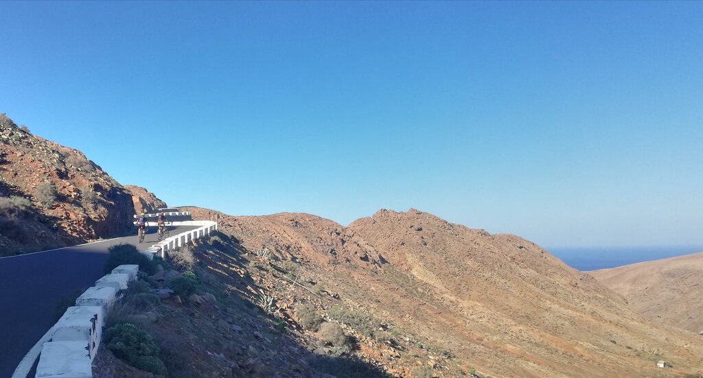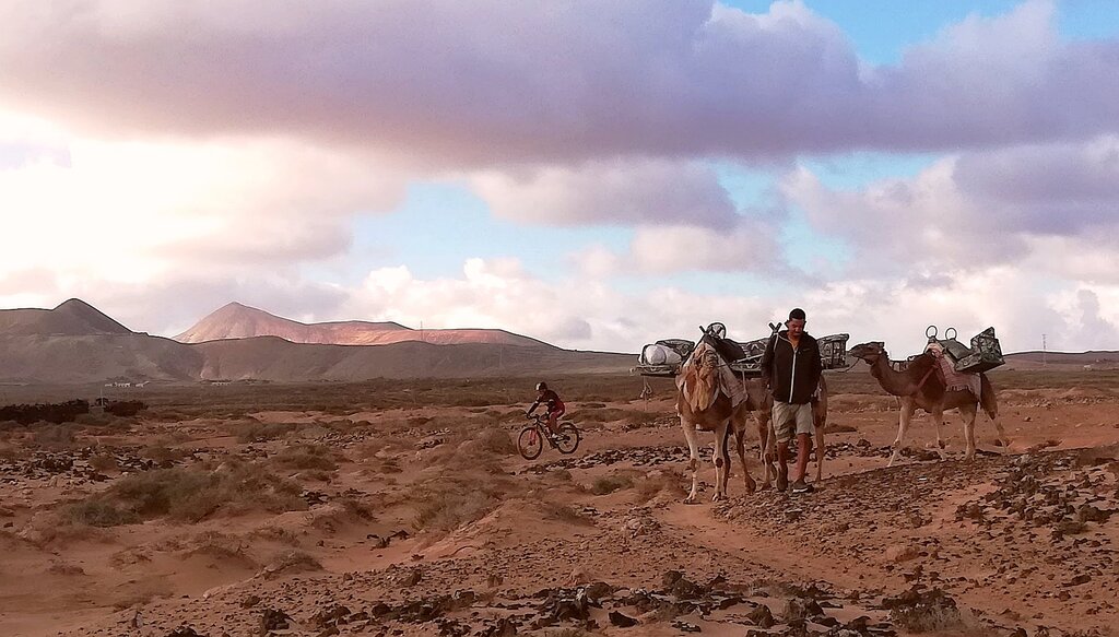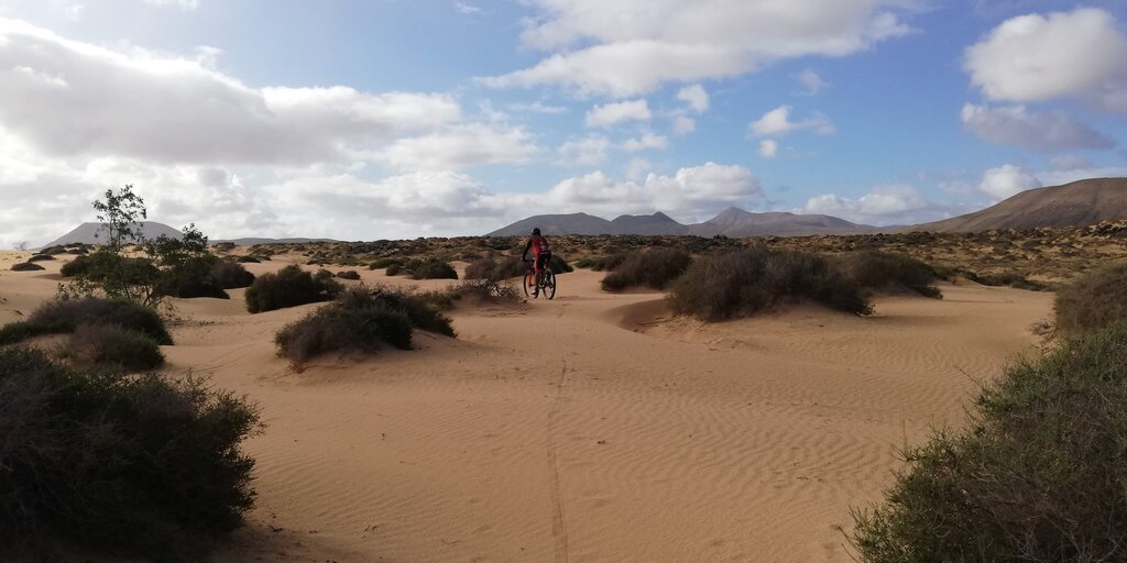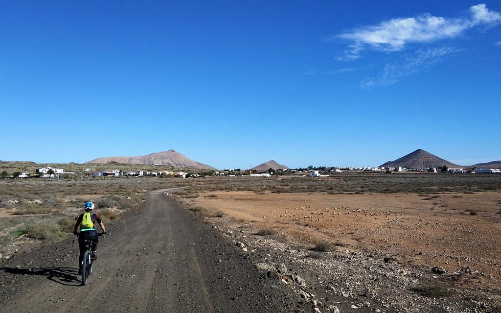 <Sie fahren weiter nach Süden, zuerst durch die Schlucht zur Vega del Río Palma (wo Mitte September die Wallfahrt zu Ehren der Schutzheiligen der Insel, La Virgen de La Peña, stattfindet, mit einem großen Zustrom von Pilgern aus der ganzen Insel) und dann auf der spektakulären Straße von Betancuria nach Pájara. Von hier aus radeln Sie abschnittsweise auf der GR (Gran Ruta), die die Insel überquert. In La Pared angekommen radeln Sie auf den weißen Sandwegen, die uns in die Wüste führen, um Costa Calma, unsere letzte "Oase", zu erreichen.