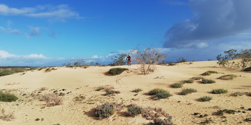 <Auf dieser ersten Etappe fahren Sie auf Küstenstraßen und Pfaden nach Norden, um Puerto del Rosario zu verlassen und die gesamte Küste in Richtung der touristischen Siedlung von Corralejo zu erradeln, vorbei an den Städten Puerto Lajas und Parque Holandes. Corralejo ist eine ausgezeichnete Möglichkeit, eine Pause einzulegen und in einem der vielen Restaurants in der Altstadt in der Nähe des Hafens etwas zu essen. Nachdem Sie wieder zu Kräften gekommen sind, verlassen Sie Corralejo, um durch den oberen Teil des Naturparks der Dünen in Richtung La Oliva zu fahren. Sie verlassen den Ort zwischen steinigen Pfaden und Dünen auf einem guten Weg, der Sie zu Ihrem Ziel führt.
