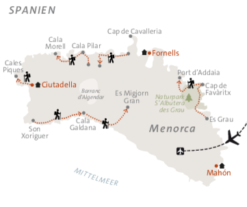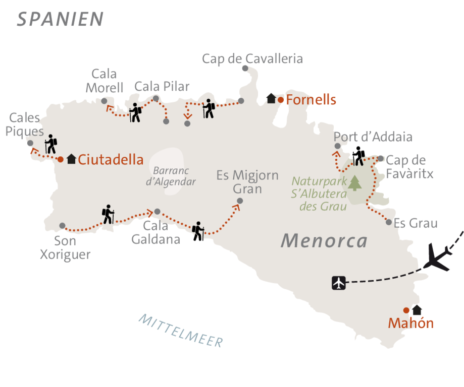 Menorca, die kleine Schwester Mallorcas, ist ein wahres Naturjuwel. Auf dieser Wanderreise entdeckst du schroffe Felslandschaften und grüne Täler, spazierst über weiße Sandstrände, springst ins türkisfarbene Wasser und schlenderst durch charmante historische Dörfer. Die Insel besticht durch ihre Ursprünglichkeit, ihre überschaubare Größe und die abwechslungsreiche Natur. Von der Hauptstadt Mahón im Osten führt dich die Route über den historischen „Camí de Cavalls“, einst Postweg, auf ausgewählten Wanderungen rund um die Insel. Dich erwartet eine bunte Mischung aus spektakulären Küstenpfaden, versteckten Buchten, idyllischen Fischerdörfern und malerischen Landschaften – jede Etappe ein neues kleines Abenteuer.