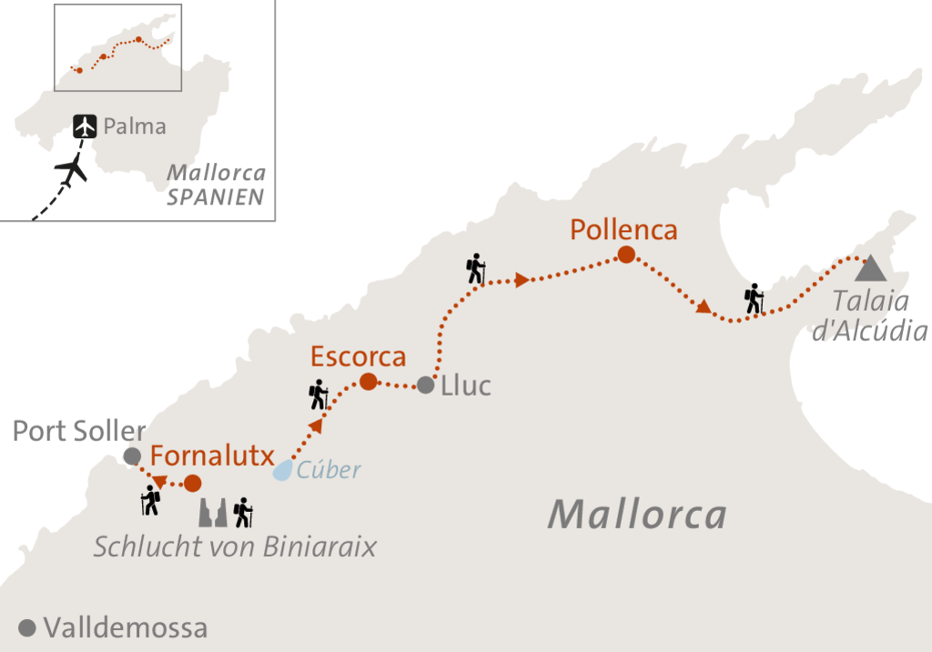 Mallorca zeigt viele Gesichter: modern und lebendig, zugleich geprägt von ursprünglicher Natur und jahrhundertealter Geschichte. Diese Reise führt dich mitten in das Herz der Serra de Tramuntana – zu steinernen Bergdörfern, stillen Tälern, imposanten Gipfeln und atemberaubenden Küstenpfaden. Eine Wanderung fügt sich an die nächste wie Perlen auf einer Kette – jede mit ihrem eigenen Zauber, jedes Ziel ein neues Highlight.