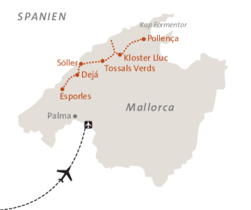 <Dein Frühstück kannst Du in einer der benachbarten Bars einnehmen. Deine erste Wanderung startet im Schatten uralter Steineichenwälder und führt dich vorbei an stillen Köhlerplätzen und alten Kalköfen bis ins charmante Valldemossa. Dort bleibt Zeit für einen Kaffee oder einen kurzen Bummel durch das Dorf. Anschließend steigst du hinauf zum legendären Reitweg des Erzherzogs Ludwig Salvador. Der Pfad verläuft mit traumhaften Ausblicken über das Tramuntana-Gebirge, bevor du über einen Pass hinab ins malerische Künstlerdorf Deià wanderst.