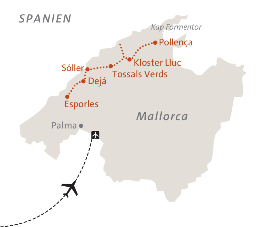 Der GR 221 – auch genannt „Ruta de Pedra en Sec“ – führt quer durch das 90 Kilometer lange UNESCO-Welterbe Serra de Tramuntana. Du wanderst auf alten Steinwegen durch eine ursprüngliche, wilde Vegetation, geprägt von Felsformationen, Schluchten und terrassierten Landschaften. Dabei durchquerst du uralte Steineichen- und Pinienwälder, immer begleitet von traumhaften Ausblicken bis zum Meer. Lass dich von den aus Stein erbauten Dörfern verzaubern, die sich malerisch an die steile Nordküste Mallorcas schmiegen. Ein besonderes Highlight dieser individuellen Trekkingtour ist die geführte Wanderung durch den Torrent de Pareis – eines der eindrucksvollsten Naturdenkmäler der Insel.